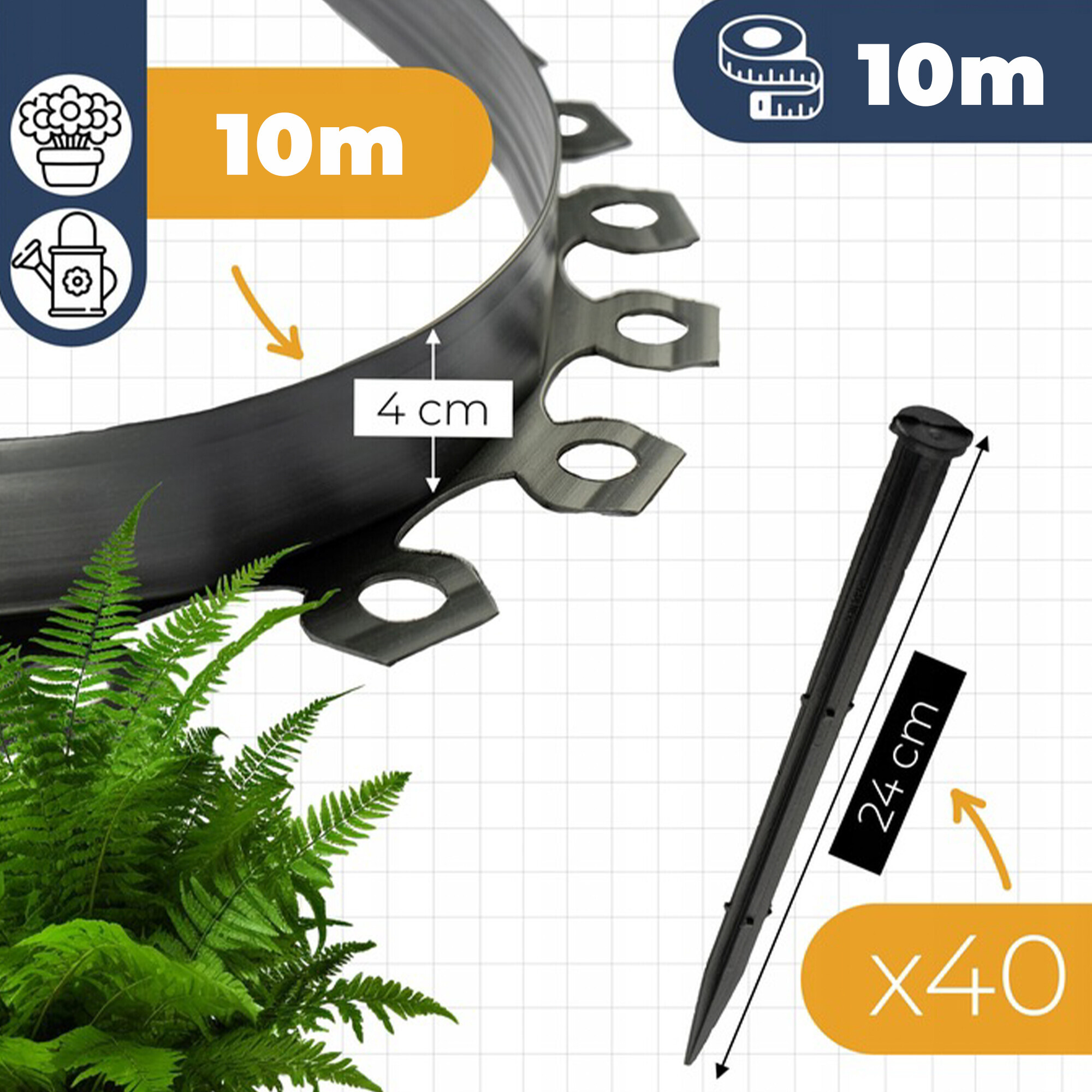 Plastični robnik za vrt je odporen proti UV sevanju, zmrzali in vlagi, kar zagotavlja dolgo življenjsko dobo tudi pri celoletni uporabi. V paketu boste našli 1 rolo dolžine 10 metrov in tudi 20 sider dolžine 24 cm, ki zagotavljajo trdno pritrditev robnika v zemlji.