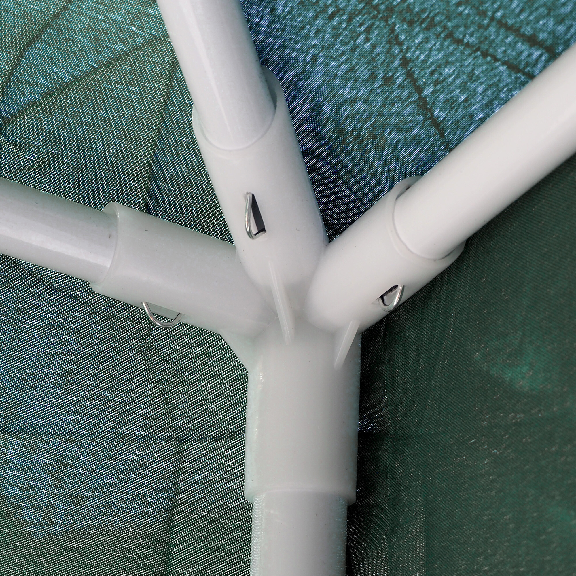 Paviljon je opremljen s trdnim okvirjem iz jeklenih cevi s premerom 18 mm in 24 mm, kar zagotavlja njegovo stabilnost. Jeklene cevi so dodatno obdelane proti koroziji, zato vam ni treba skrbeti za njihovo poškodbo zaradi vlage ali dežja.