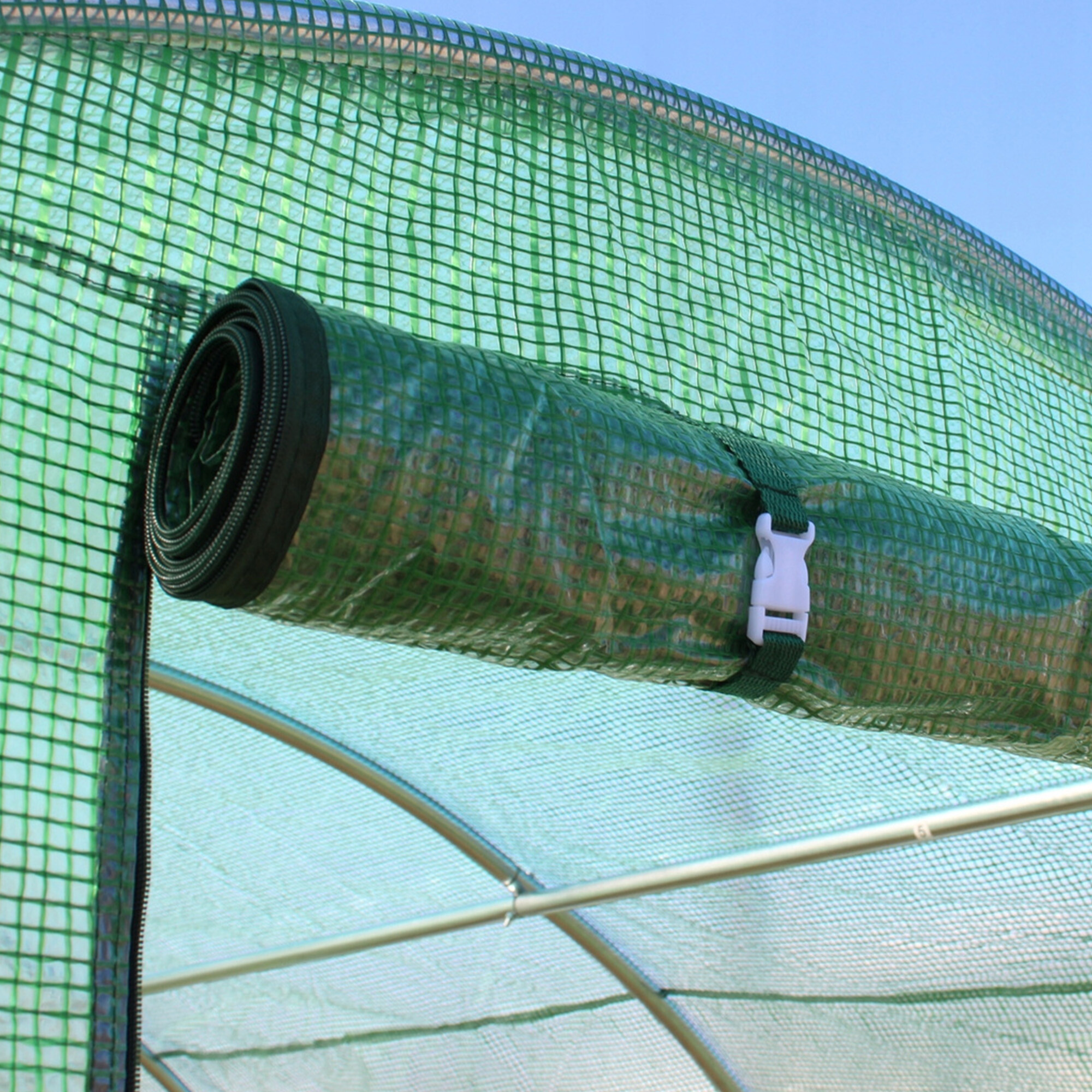 Konstrukcijo sestavljajo jeklene cevi, prašno lakirane za maksimalno trdnost in popolno zaščito pred korozijo.Spoji so priviti, kar zanesljivo zagotavlja togost konstrukcije.Široka rolo vrata z dvojnimi zadrgami za lažji vstop.