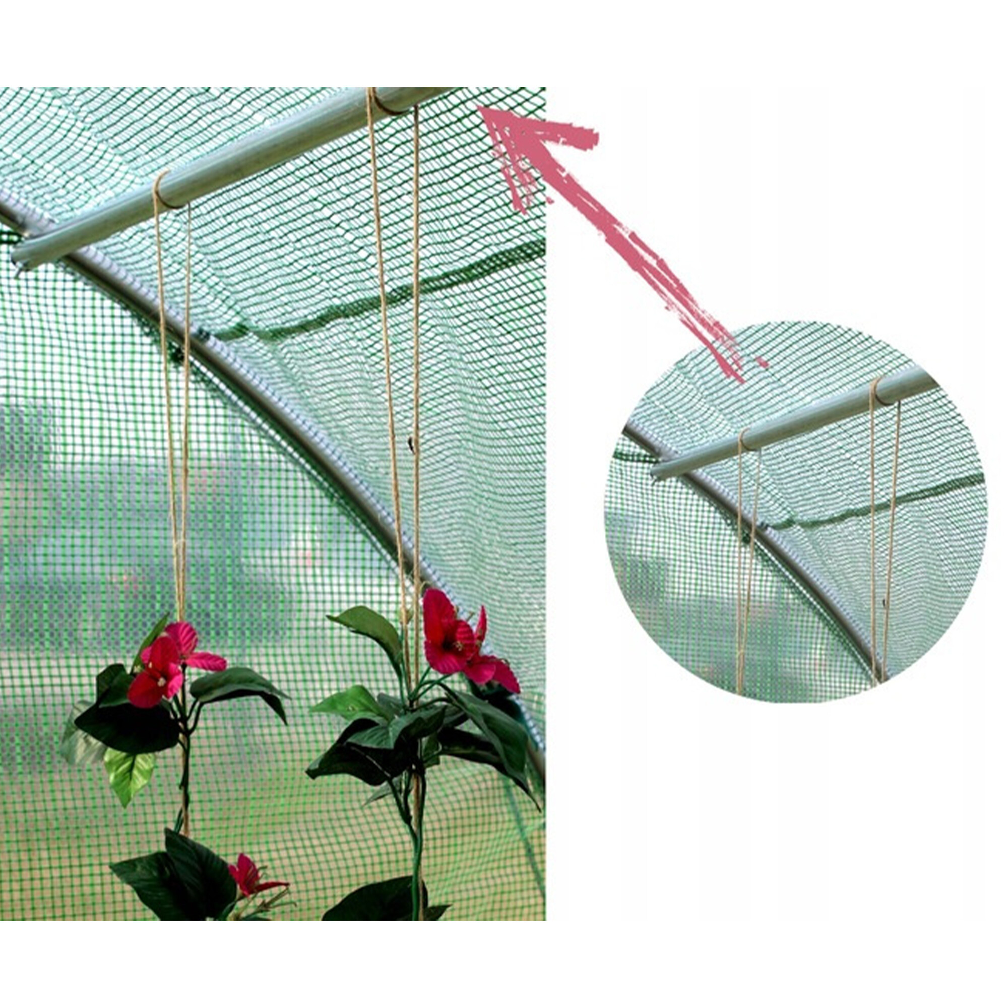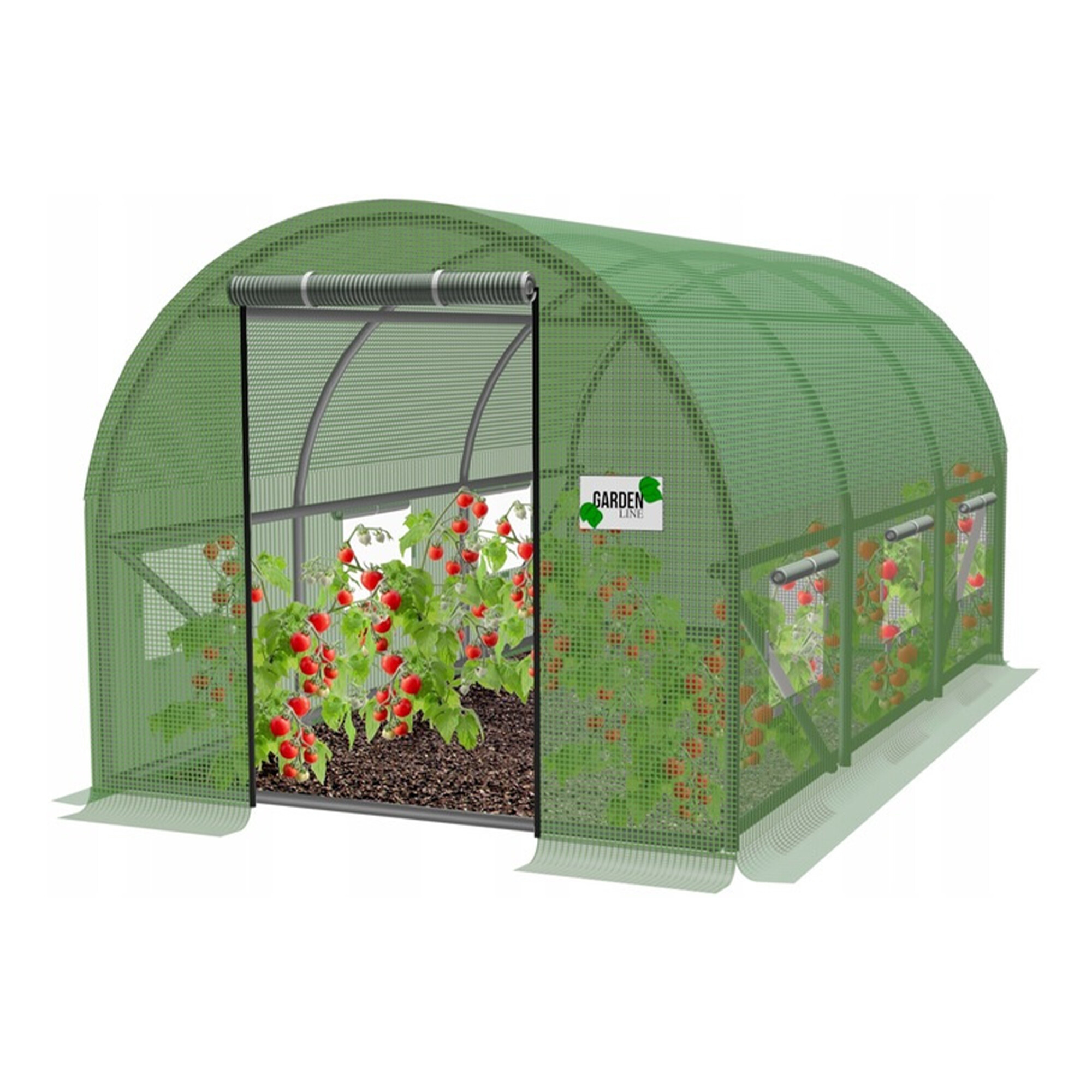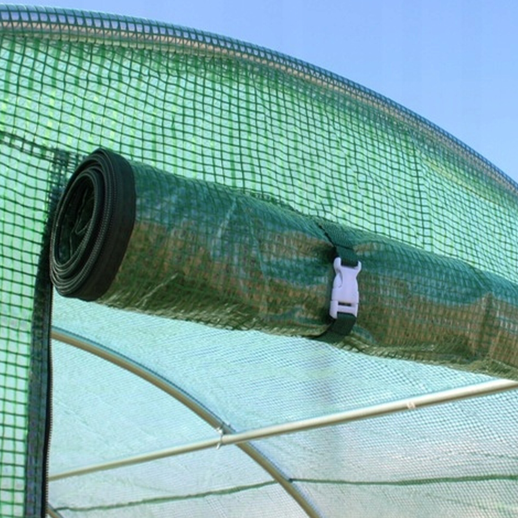 Zelena mrežica iz PP, vgrajena v strukturo folije, jo ojača in zaščiti pred trganjem in mehanskimi poškodbami.Široka rolo vrata z dvojnimi zadrgami za lažji vstop.