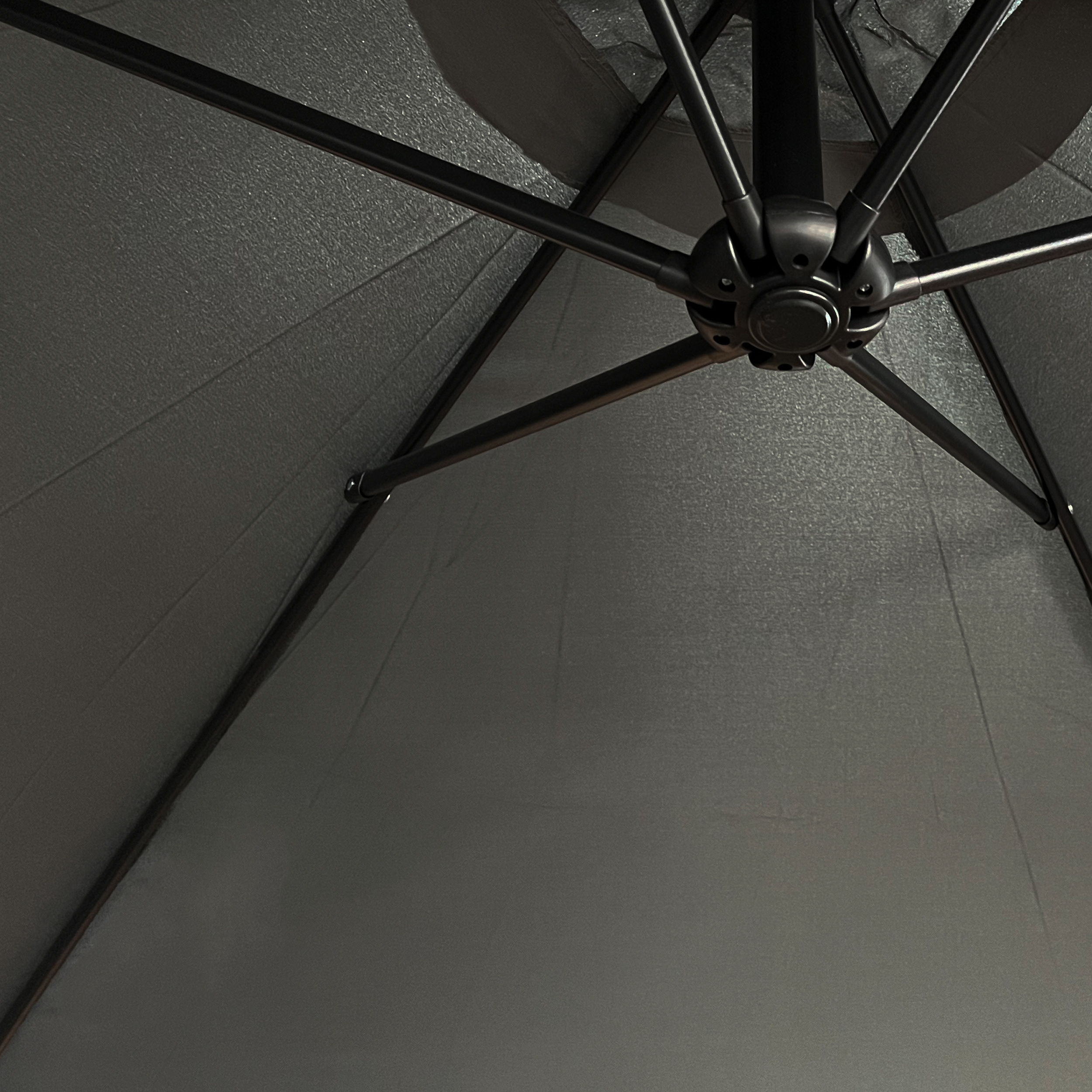 Vrtni senčnik iz trpežnega poliestra, katerega noga je nameščena zunaj senčenega območja.