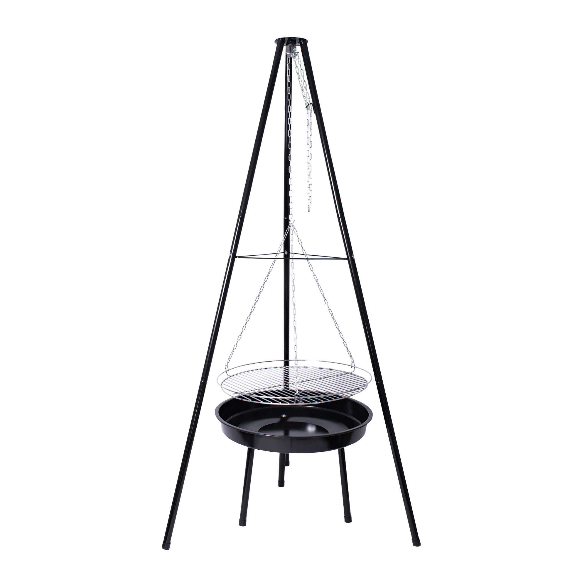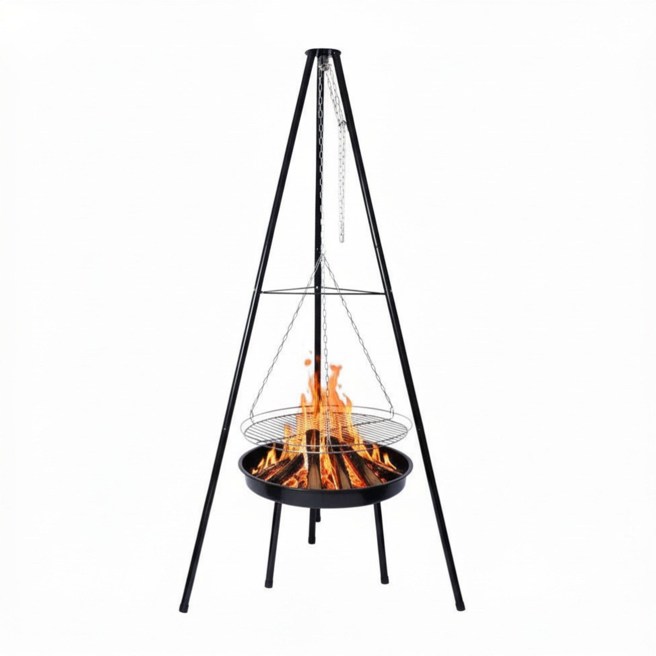 Če imate radi kampiranje in kuhanje v klasičnem kotličku, vam bo prav prišel ta trinožnik, s katerim boste lahko obesili rešetko ali kotliček nad ognjišče. Za obešanje služi kavelj na verižici. Zaradi uporabljenega materiala ima trinožnik zelo dolgo življenjsko dobo.