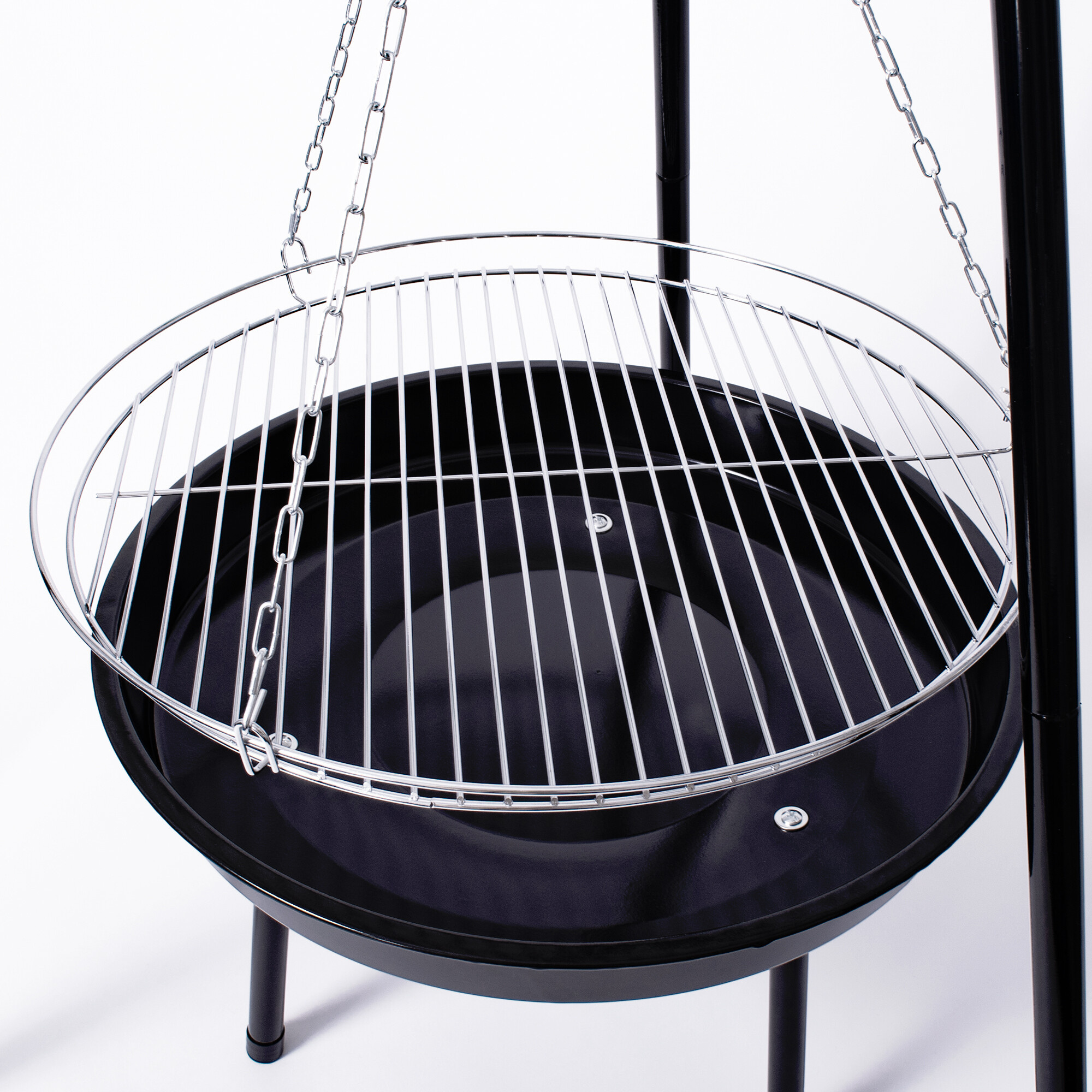- Nastavljiva višina rešetke, zahvaljujoč škripec, nameščenem v zgornjem delu trinožnika