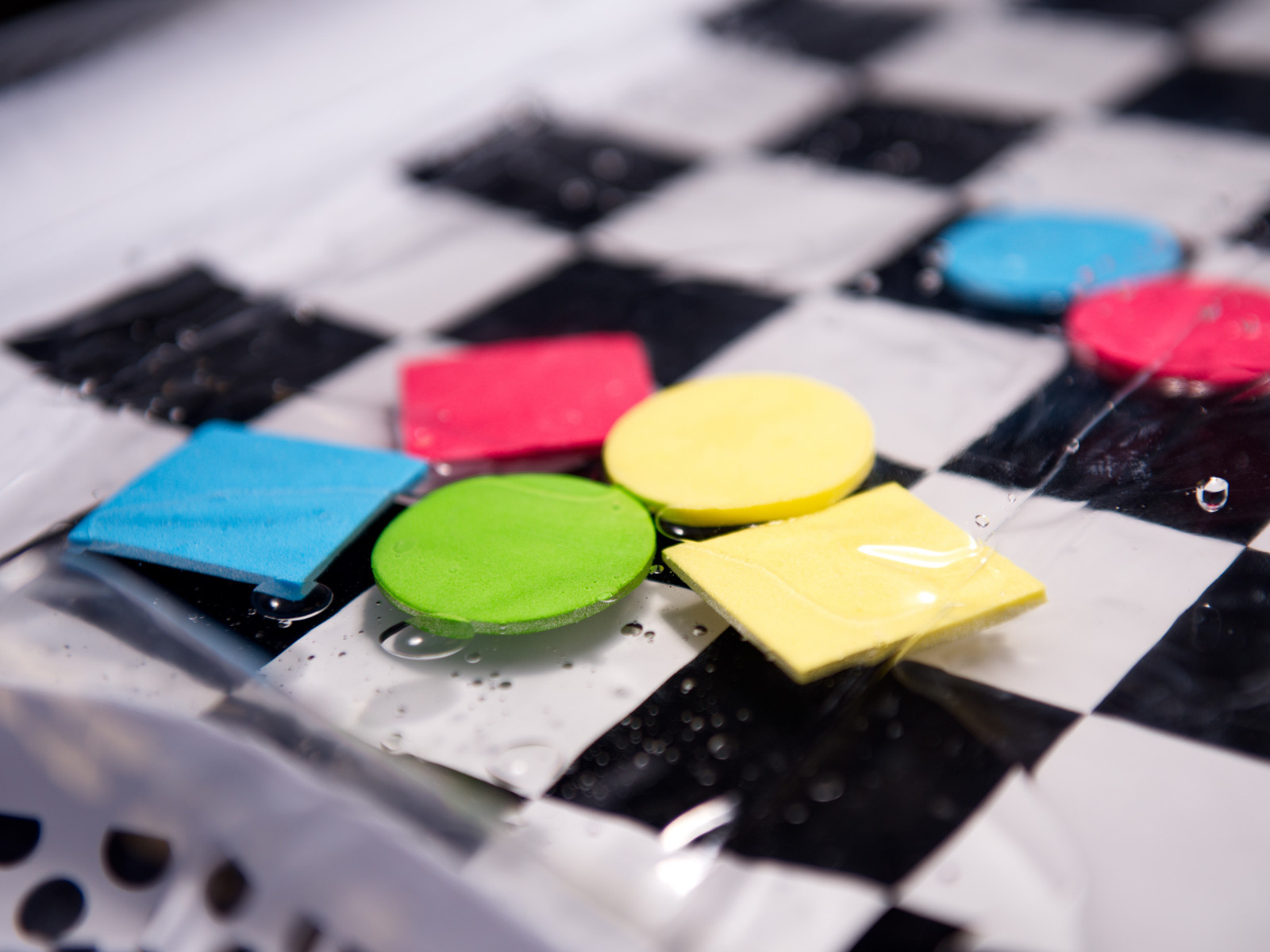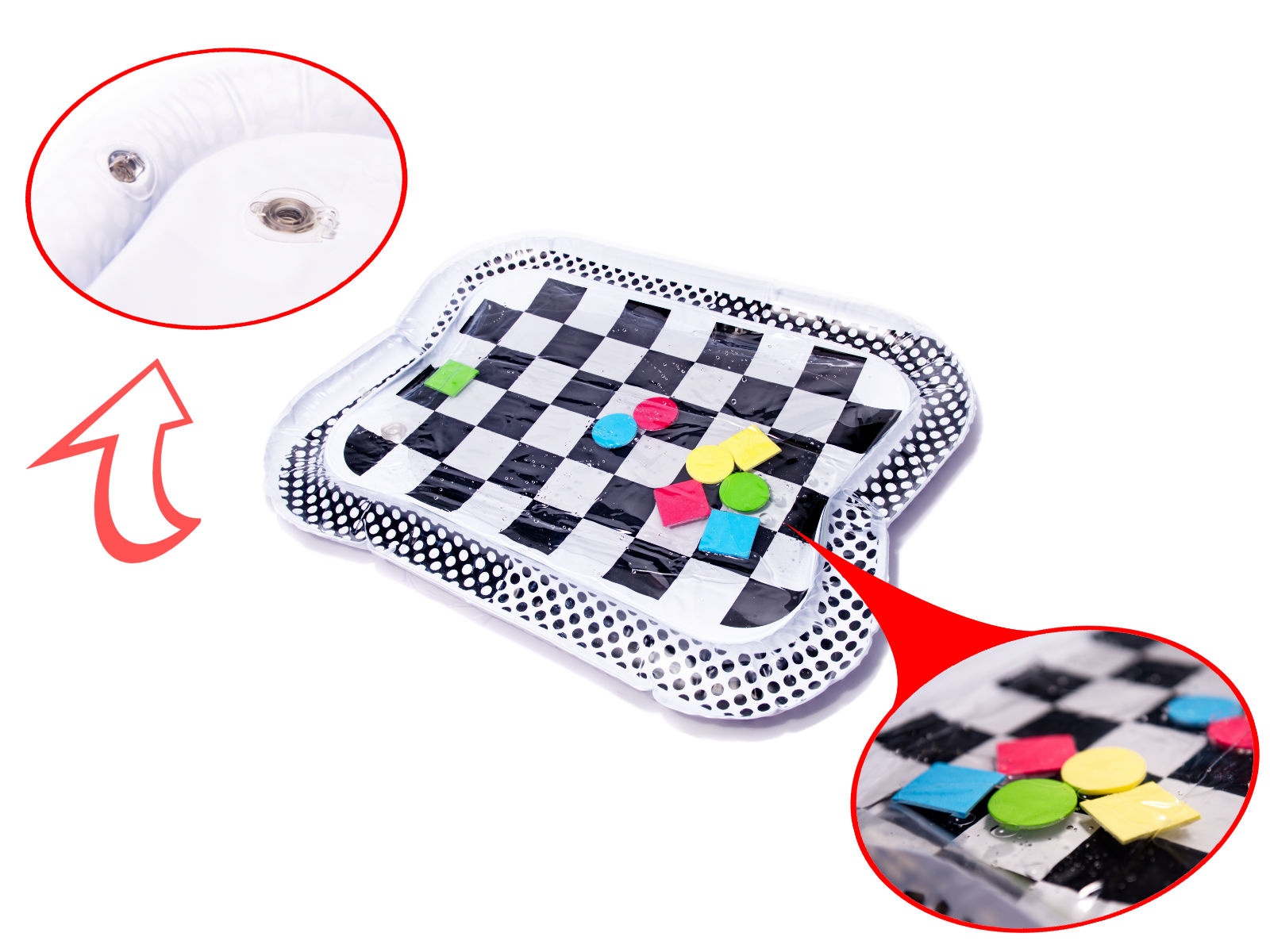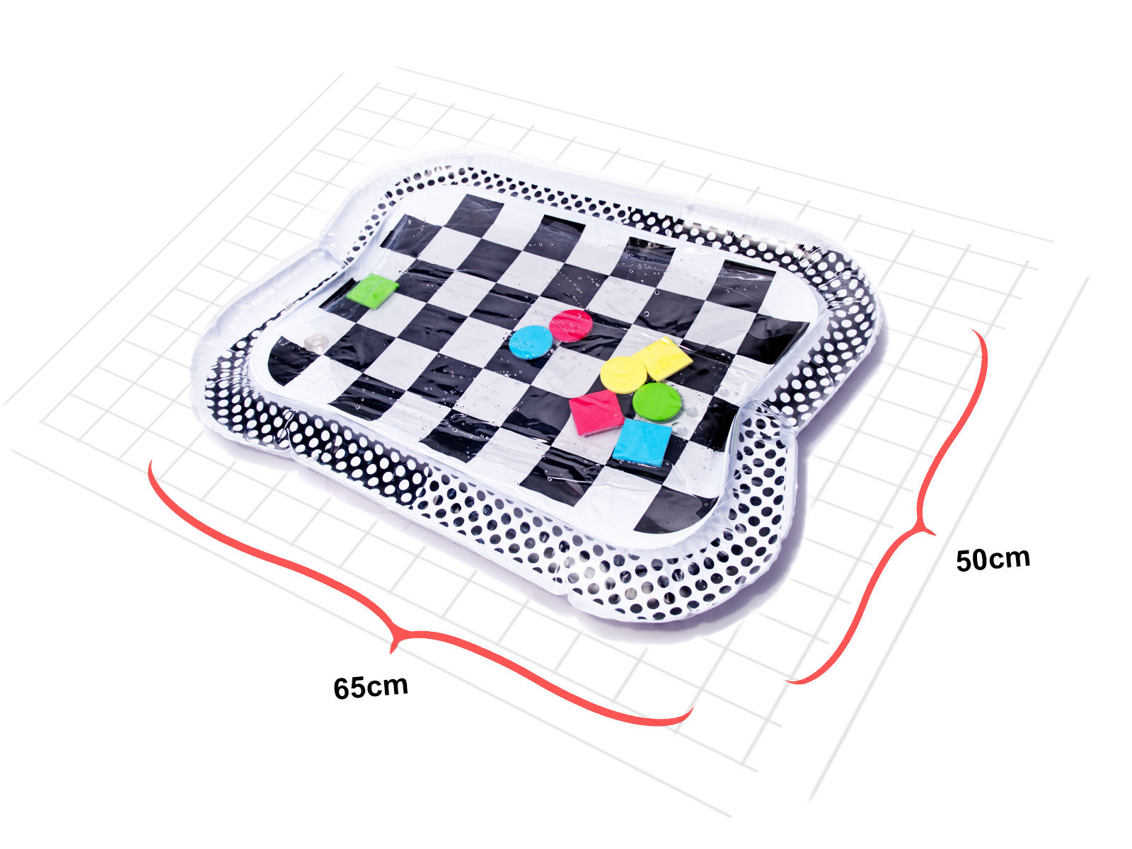 Znotraj podloge so nameščeni barvni geometrijski liki, ki se premikajo, ko se otrok premika. Plavajoči elementi pritegnejo otrokovo pozornost. Rob podloge mora biti napihnjen z zrakom, medtem ko je sredina napolnjena z vodo. Za boljše rezultate lahko sredino napolnite delno z vodo in delno z zrakom.
