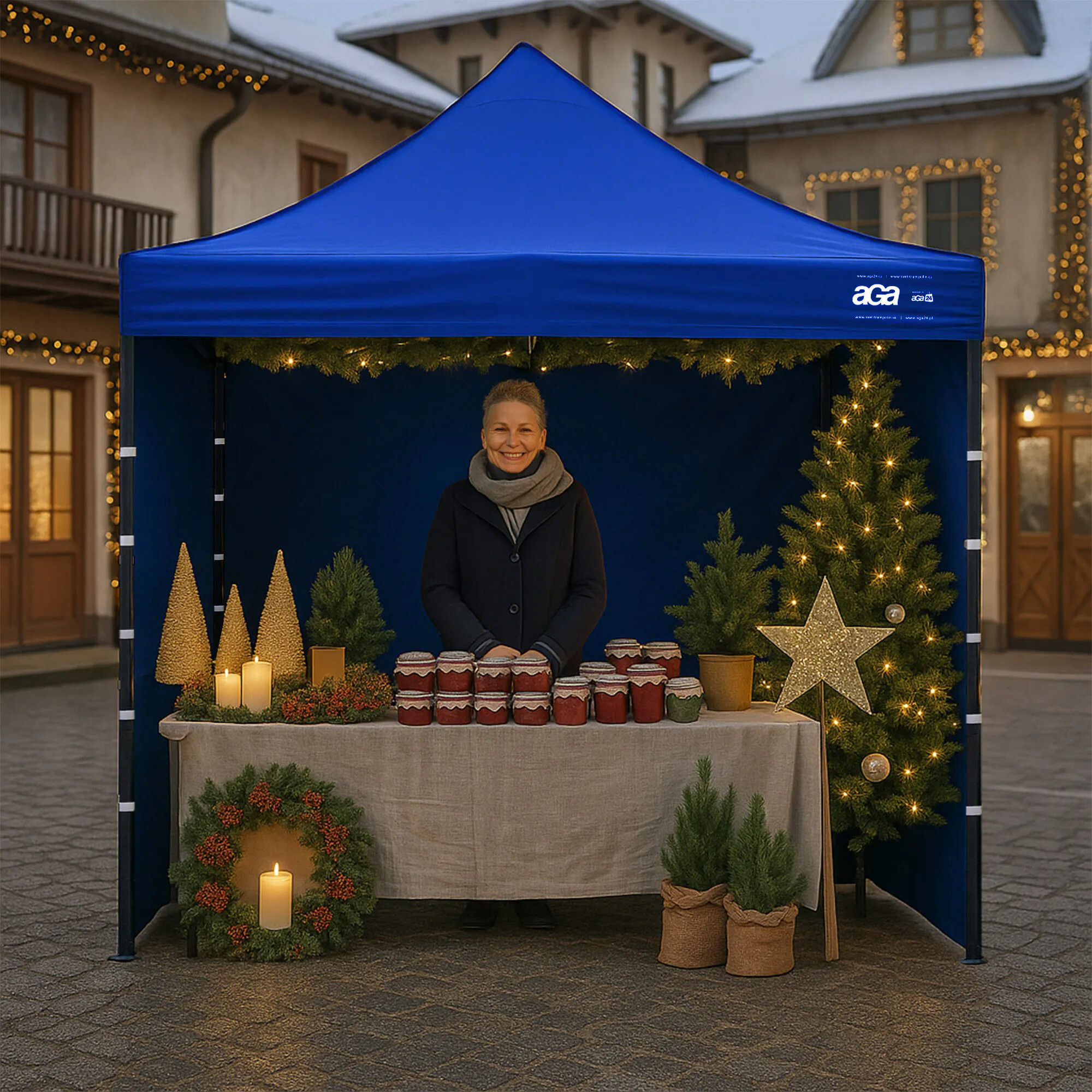 Prodajna stojnica 2×2 m s trdno škarjasto konstrukcijo je namenjena za kmečke tržnice, promocijske dogodke, razstave in sezonsko prodajo.