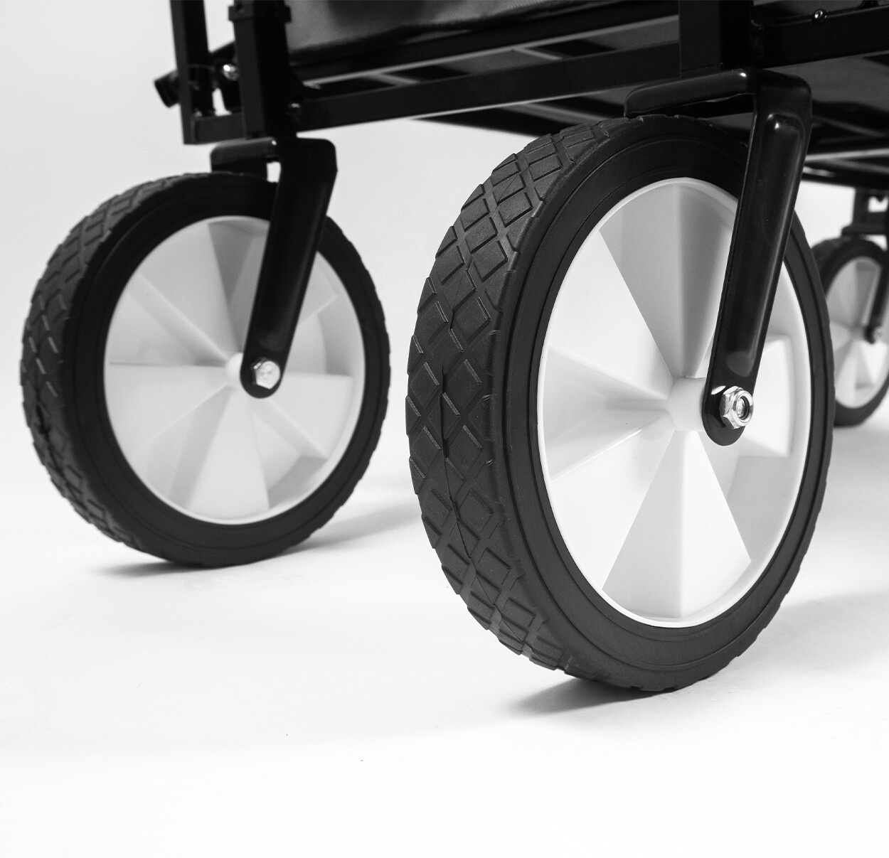Zaradi velikega tovornega prostora lahko v voziček spravite vse potrebno in ga prepeljete na trpežnih plastičnih kolesih.