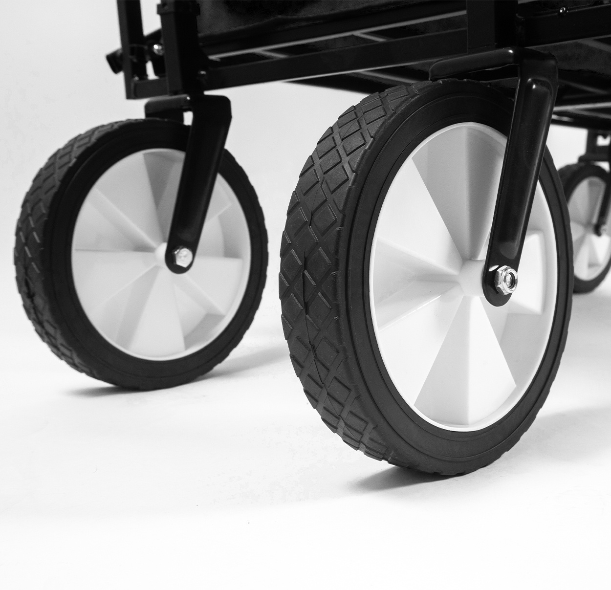 Zaradi velikega tovornega prostora lahko v voziček spravite vse potrebno in ga prepeljete na trpežnih plastičnih kolesih.