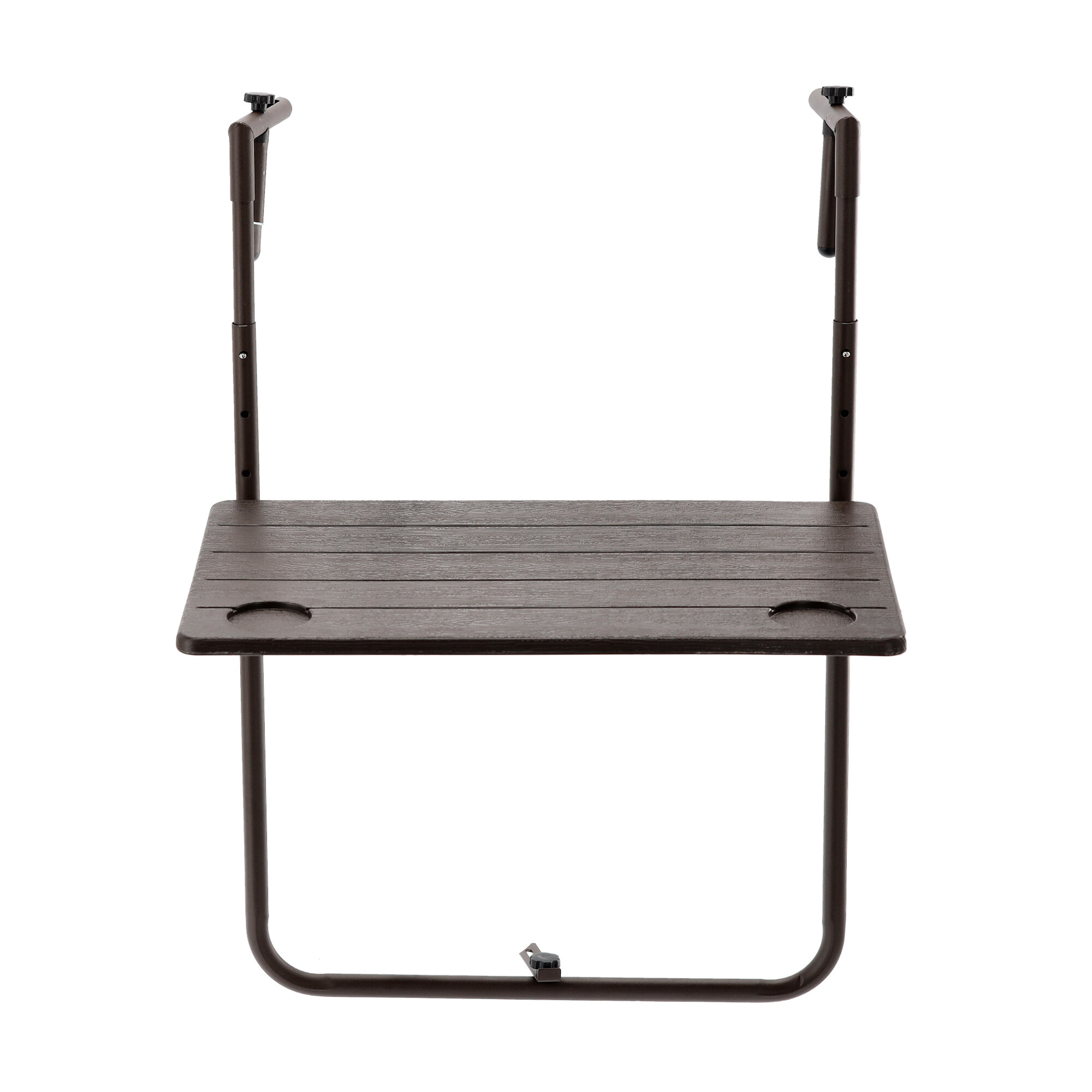 Miza je izdelana iz trpežnega materiala, ki je zasnovan tako, da prenese tudi zahtevne pogoje zunanjega okolja. Rjava barva, ki posnema naravni les, daje mizi eleganten videz, ki se popolnoma zlije z okolico vašega balkona.