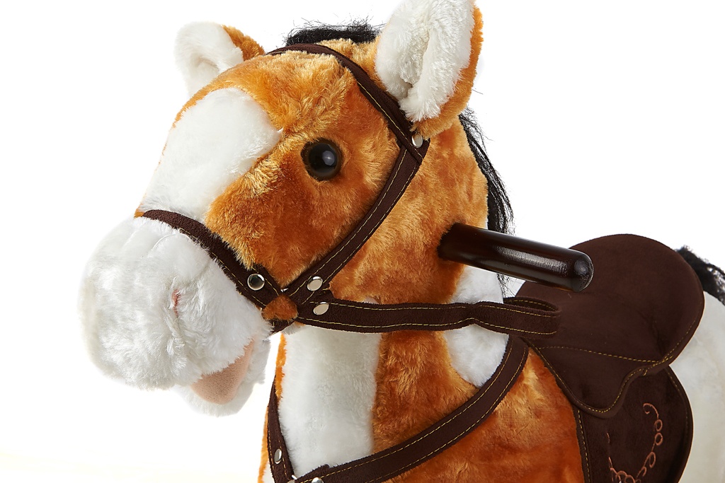 - Igrača ima sedlo s stremeni, uzdo in lesene ročaje