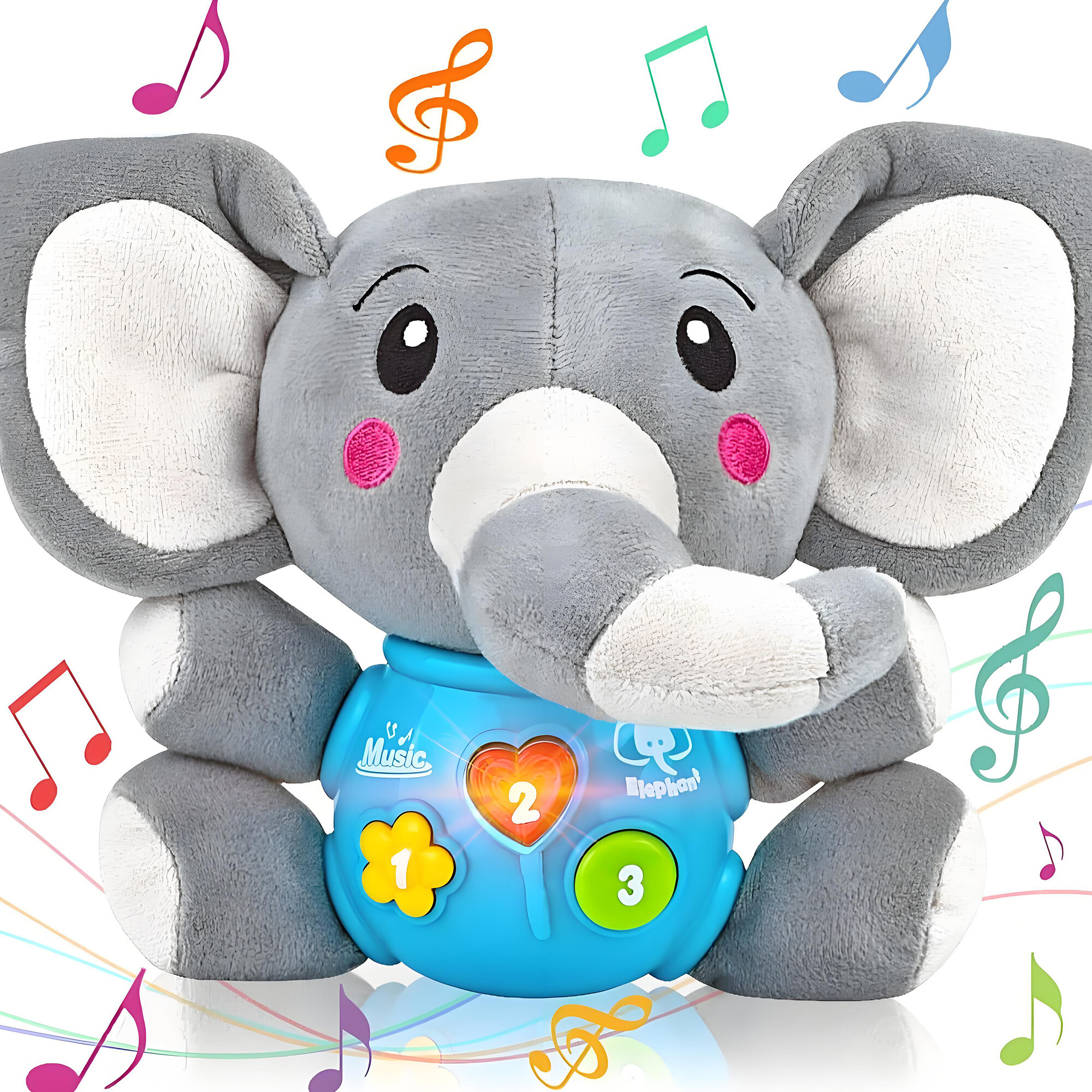 Zeleni okrogli gumb s številko tri: Zabavni zvoki. Želite nasmejati svojega otroka? Zeleni gumb je poln veselih in zabavnih zvokov, ki spodbujajo smeh in veselje. Slonček bo postal zabaven spremljevalec za igro in odkrivanje.