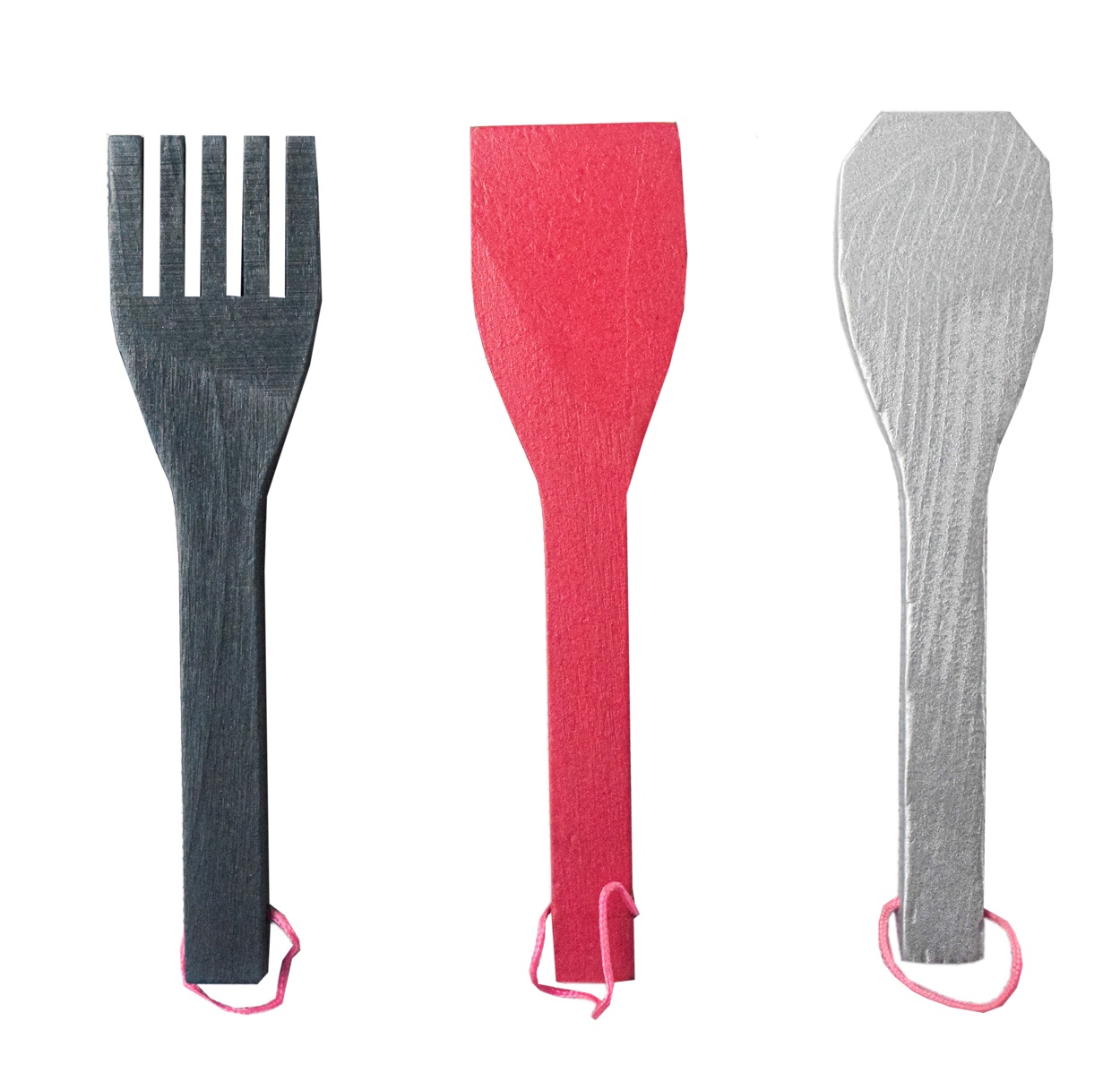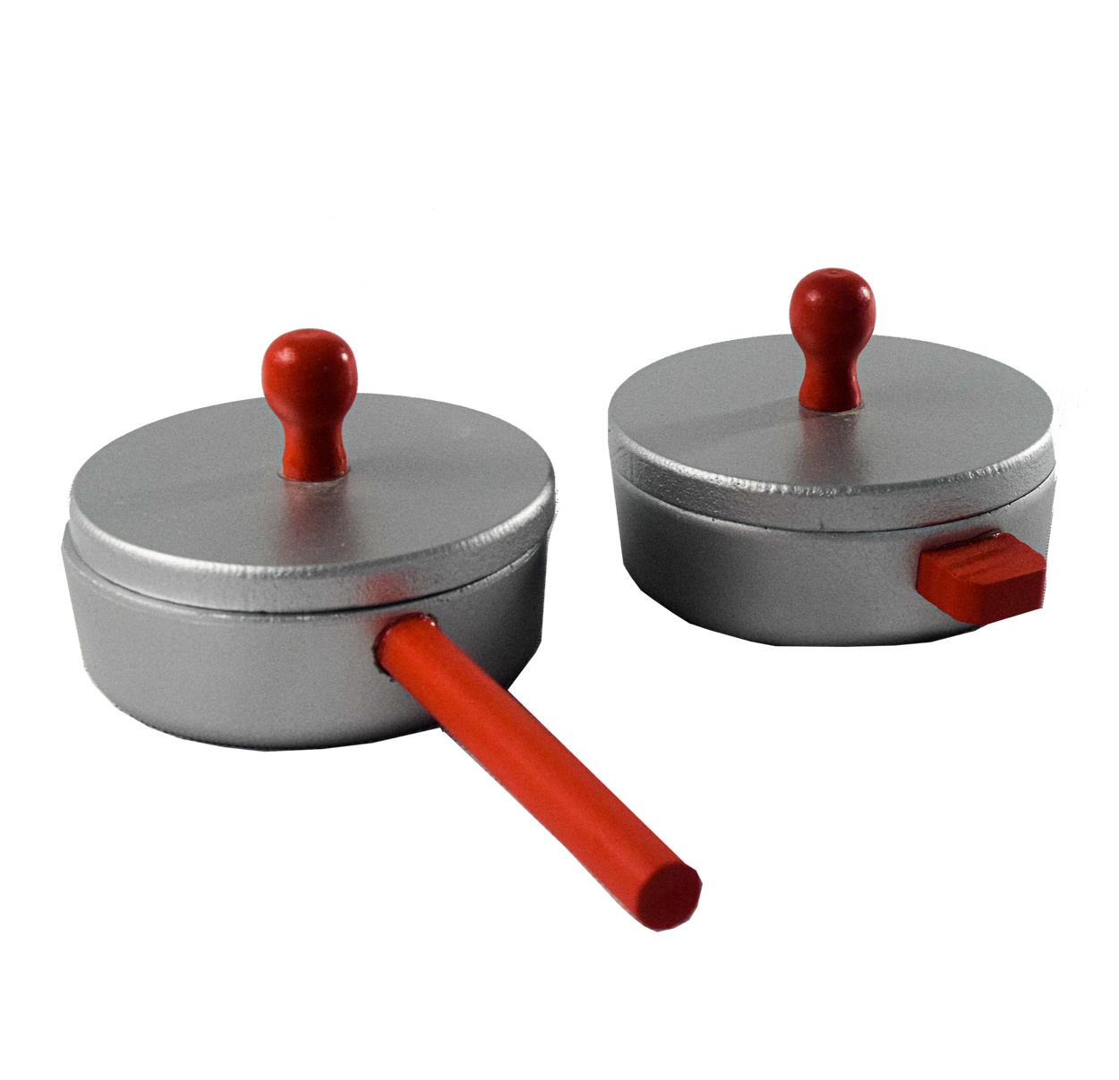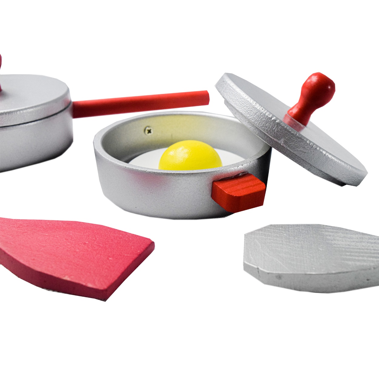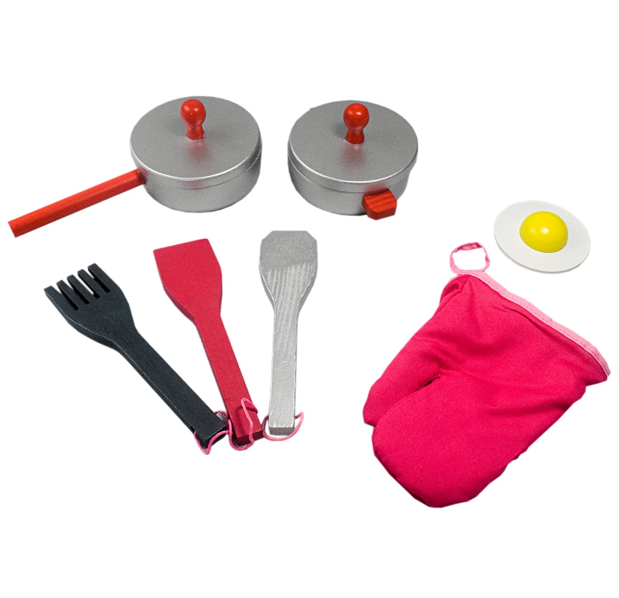 Otroški leseni kuhinjski pribor COOKWARE SET 7, vsebuje dva lonca, dve lopatki, vilico in prijemalko.