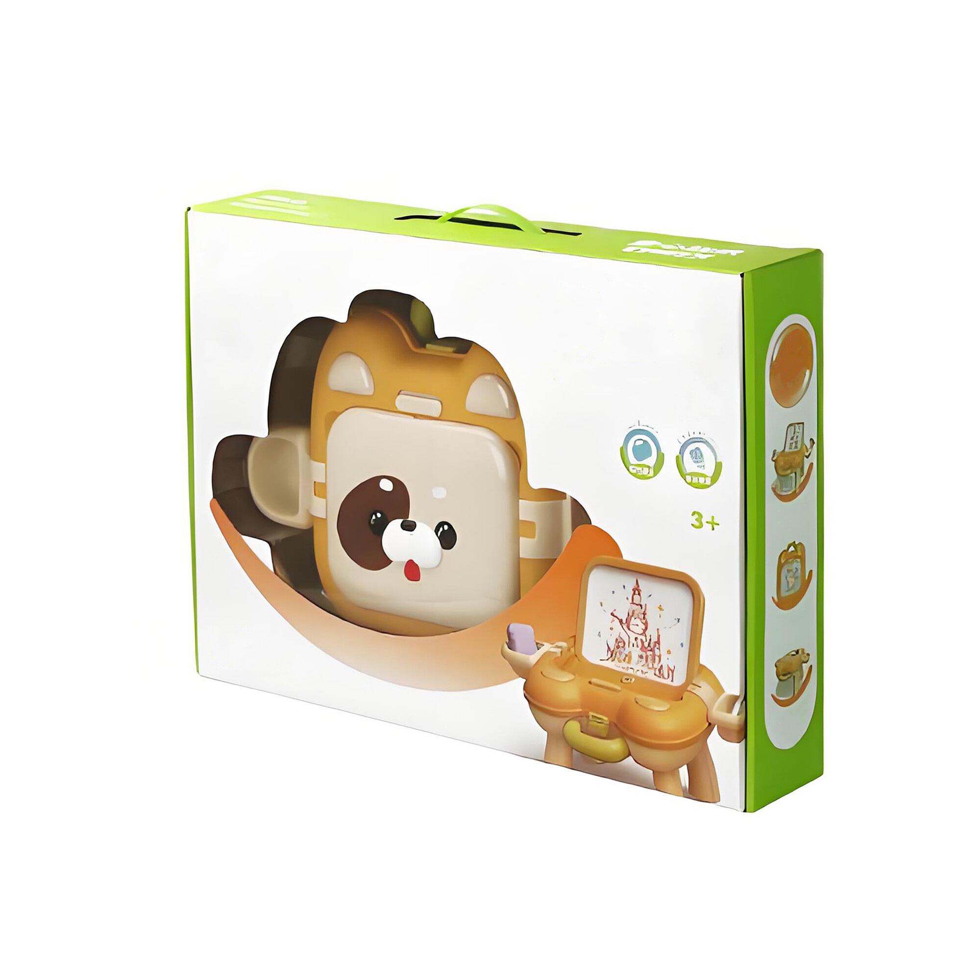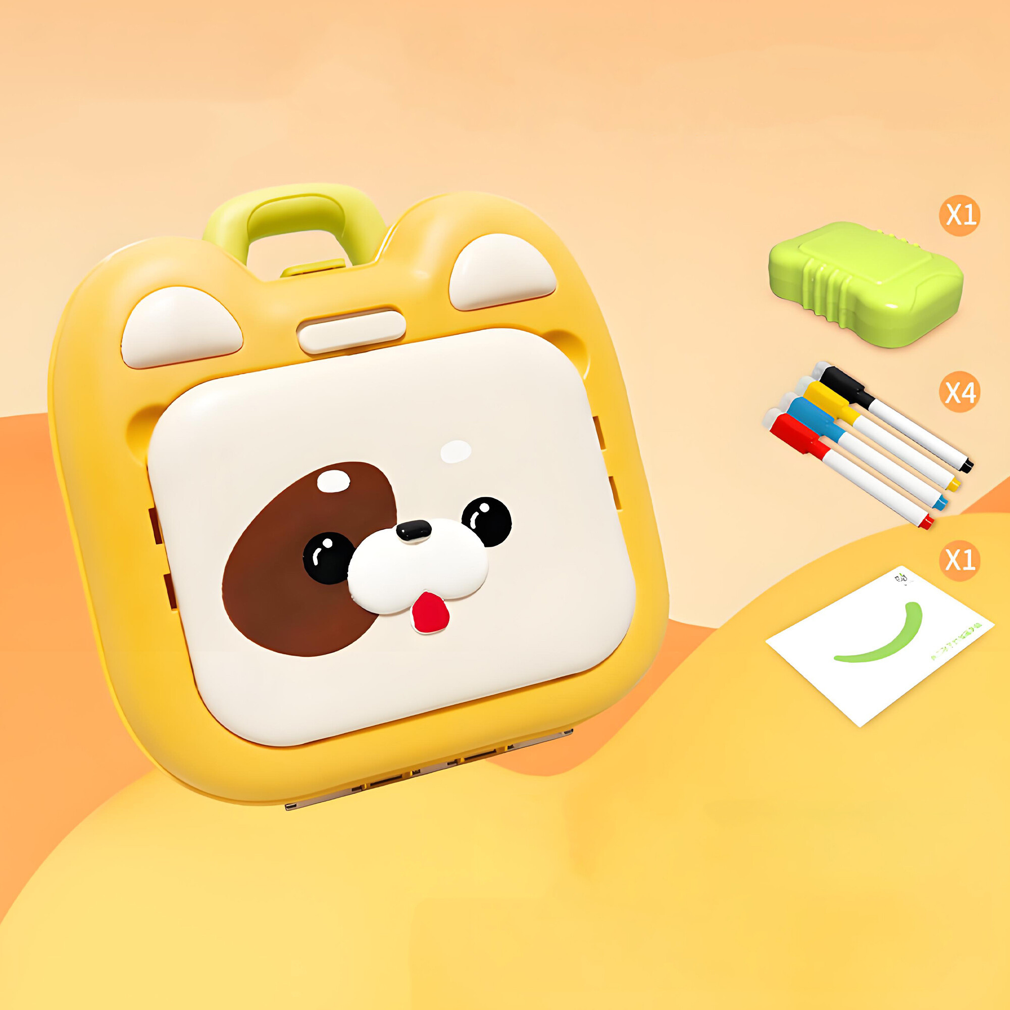 Inovativna zasnova, ki omogoča enostavno preoblikovanje iz kovčka v stolček s tablo. Zaradi tega je idealen za uporabo doma, v vrtcu ali na poti. Otroci lahko svoj kovček enostavno prenesejo kamor koli potrebujejo in ga v trenutku spremenijo v praktičen stolček s tablo za flomastre.