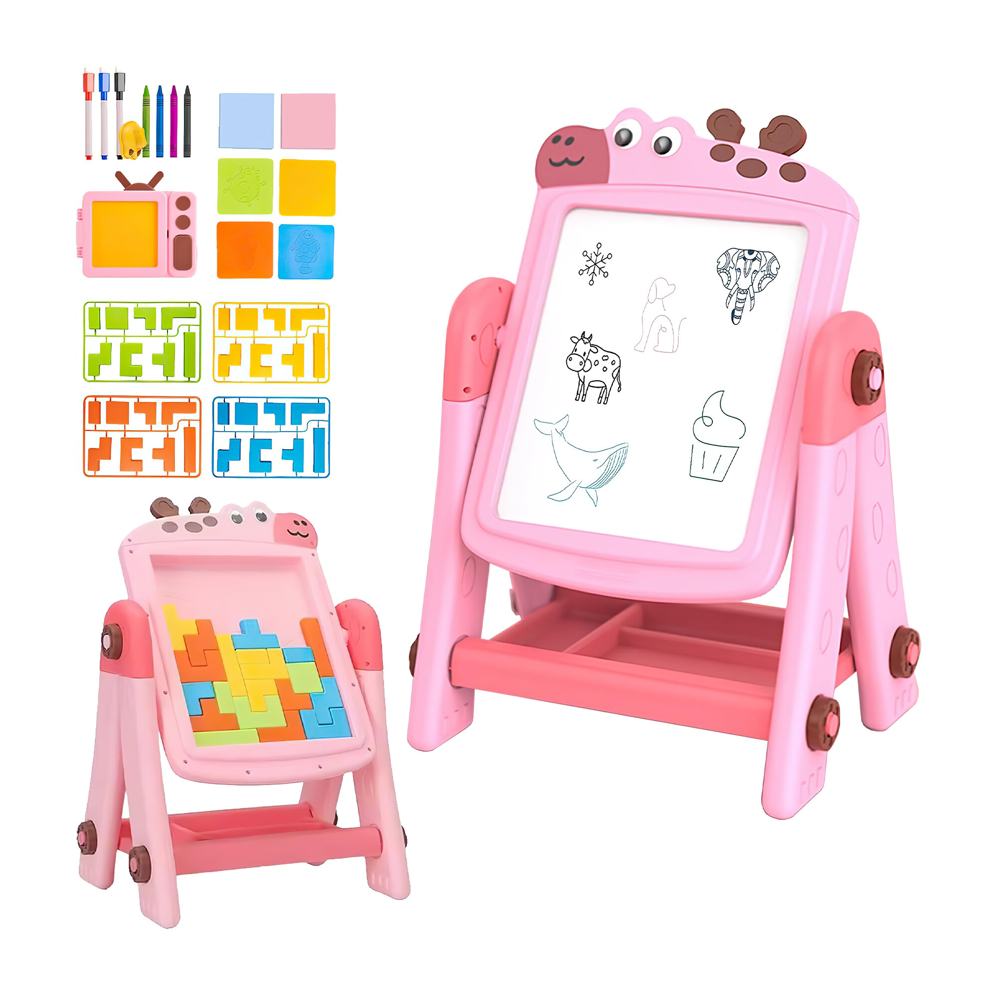 Aga4Kids Otroška tabla za flomastre prihaja z bogatim kompletom dodatkov, ki zagotavlja, da bodo vaši otroci imeli vse, kar potrebujejo za takojšnjo zabavo - 4x voščenka, 3x flomaster, 1x gobica za brisanje, listki, šablone za risanje in tabla.
