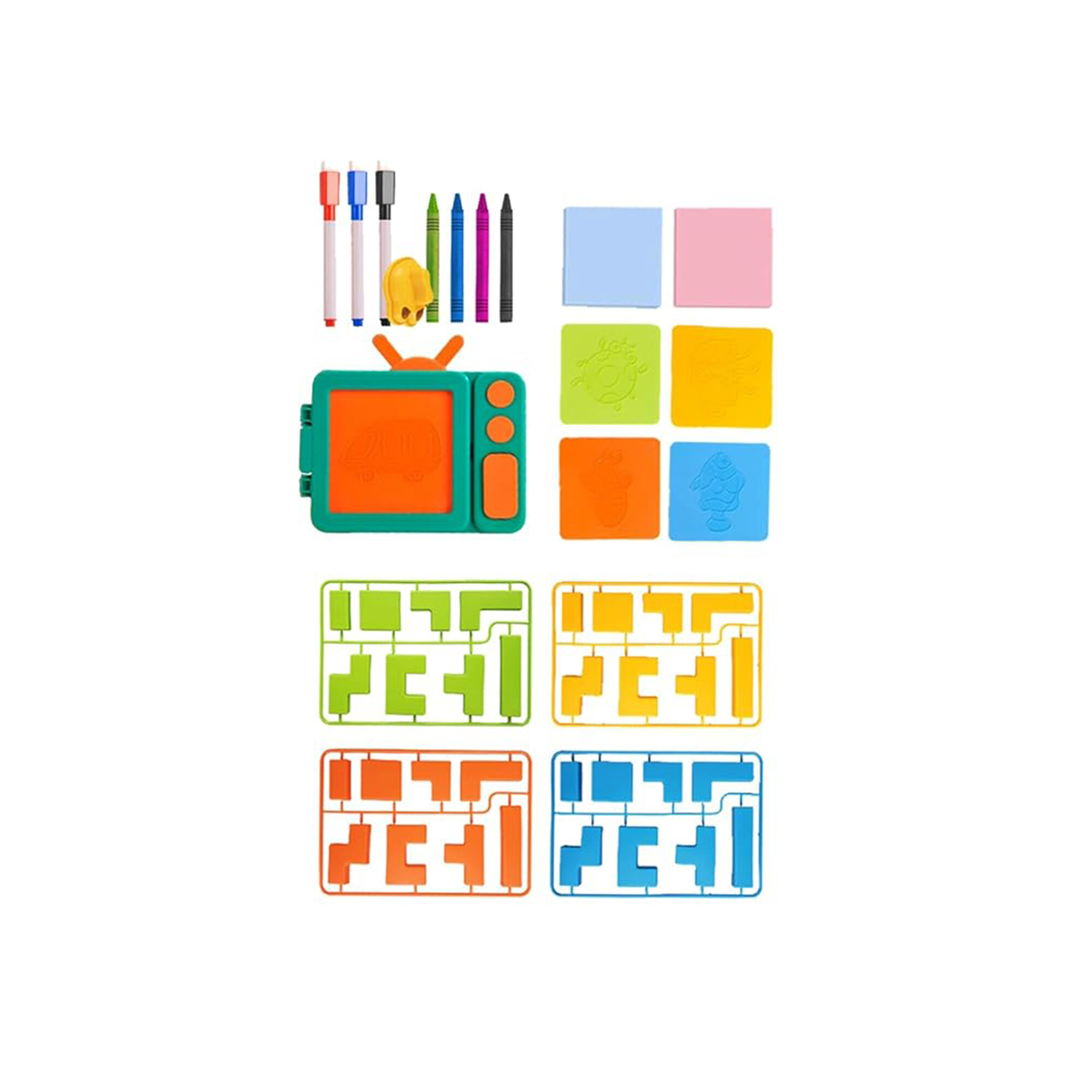 Aga4Kids Otroška tabla za flomastre prihaja z bogatim kompletom dodatkov, ki zagotavlja, da bodo vaši otroci imeli vse, kar potrebujejo za takojšnjo zabavo - 4x voščenka, 3x flomaster, 1x gobica za brisanje, listki, šablone za risanje in tabla.