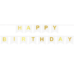 Bela transparenta z zlatim napisom Happy Birthday, idealna za otroške rojstne dneve.