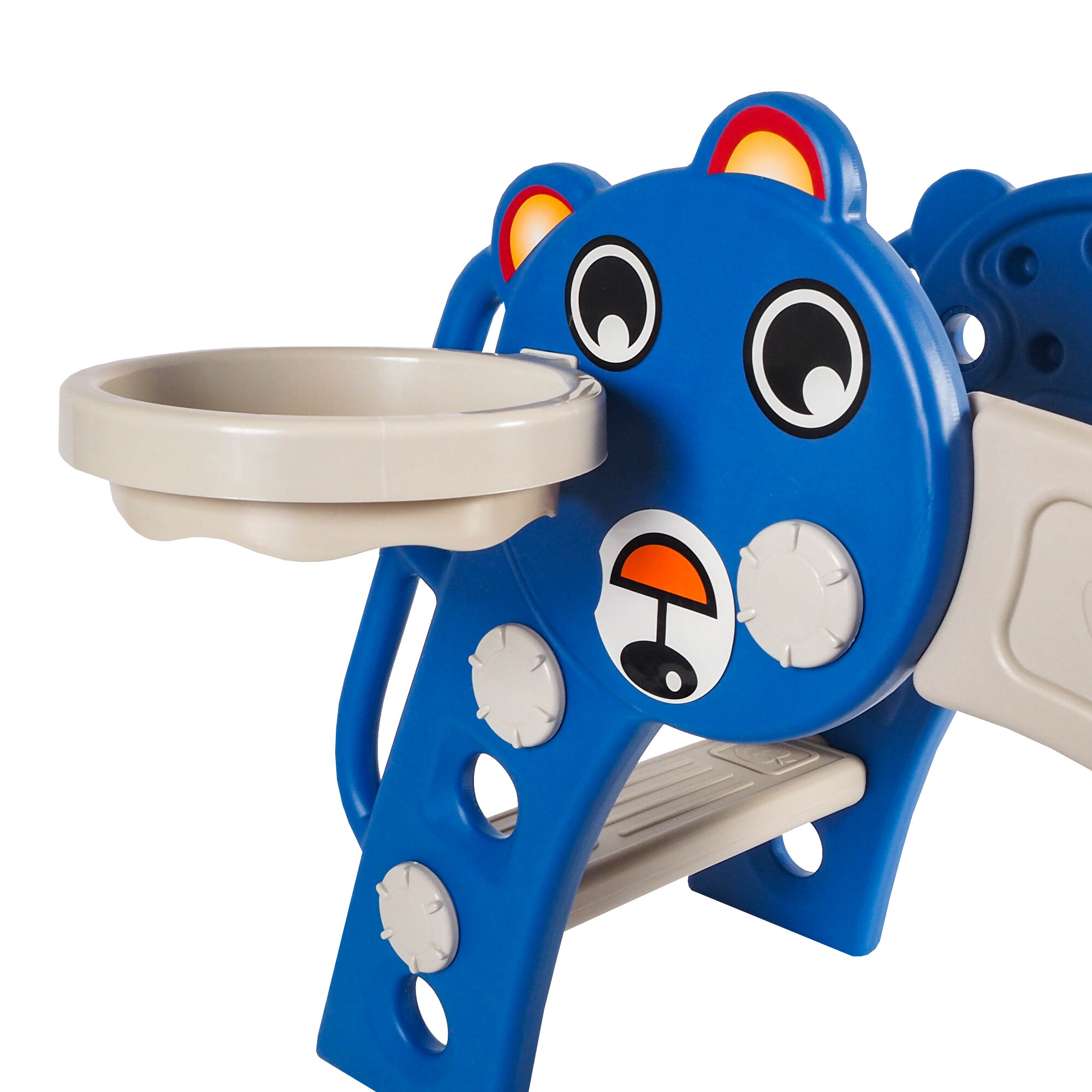 Opremljena je tudi s košem za košarko in žogo, kar otrokom ponuja dodatne možnosti za zabavo in gibanje.