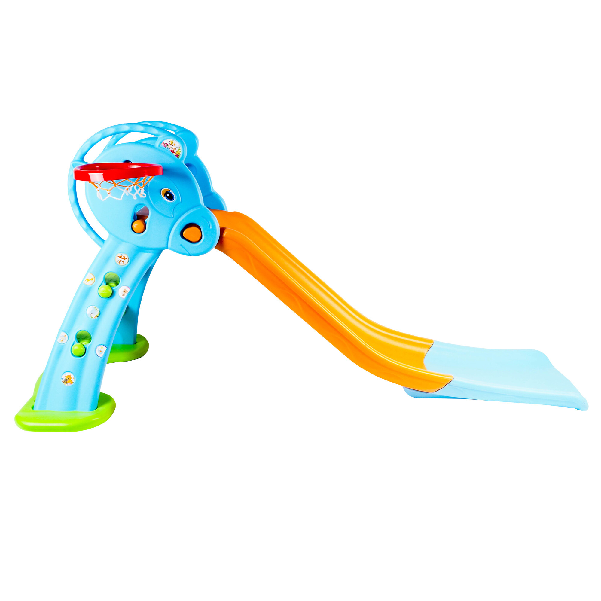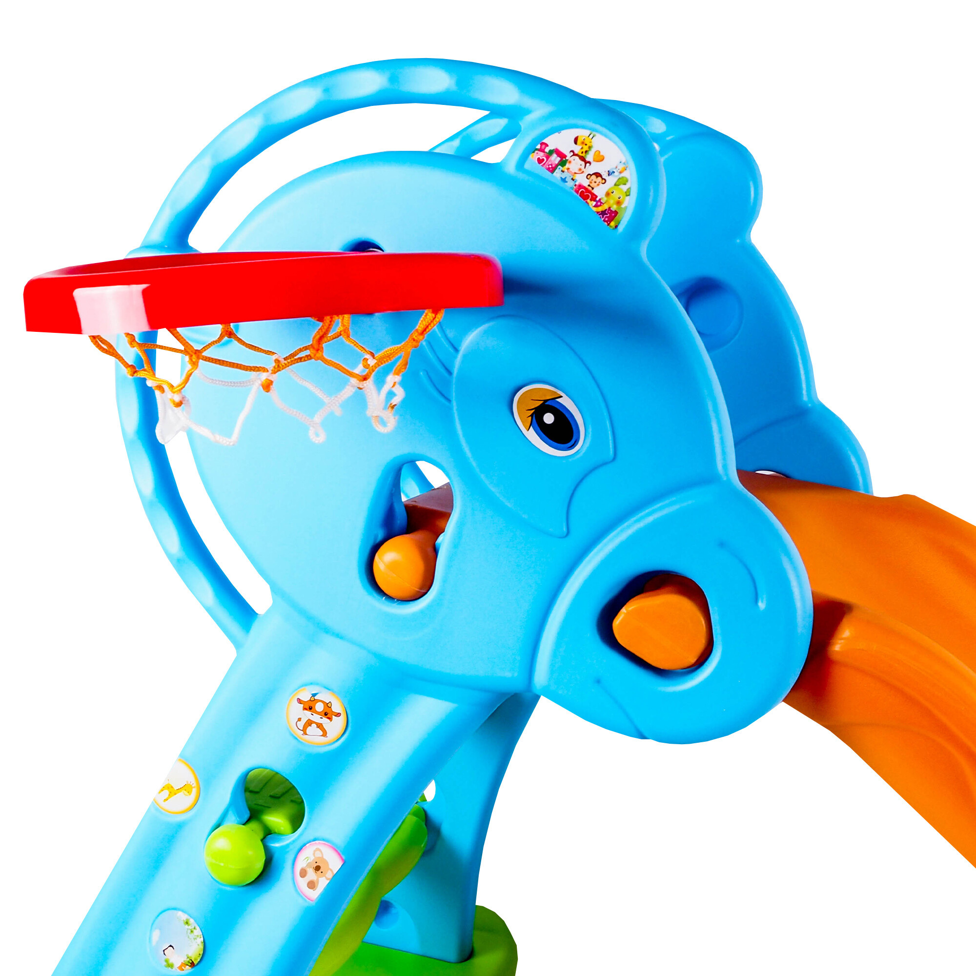 Opremljena je tudi s košem za košarko in žogo, kar otrokom ponuja dodatne možnosti za zabavo in gibanje.