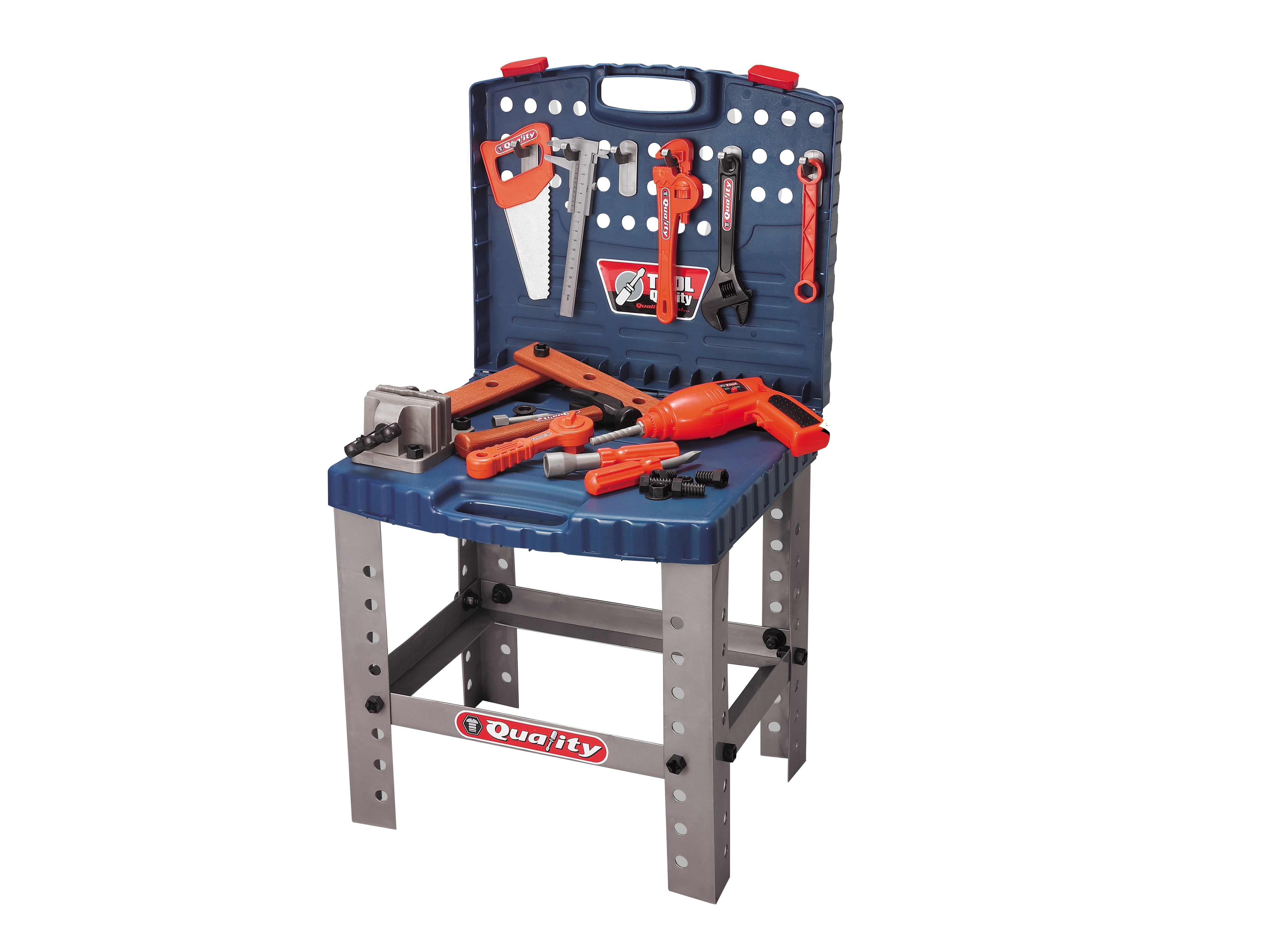 Kovček vsebuje vse, kar mali mojster potrebuje - žago, izvijač, kladivo, francoski ključ, vijake, primež in druge dodatke.