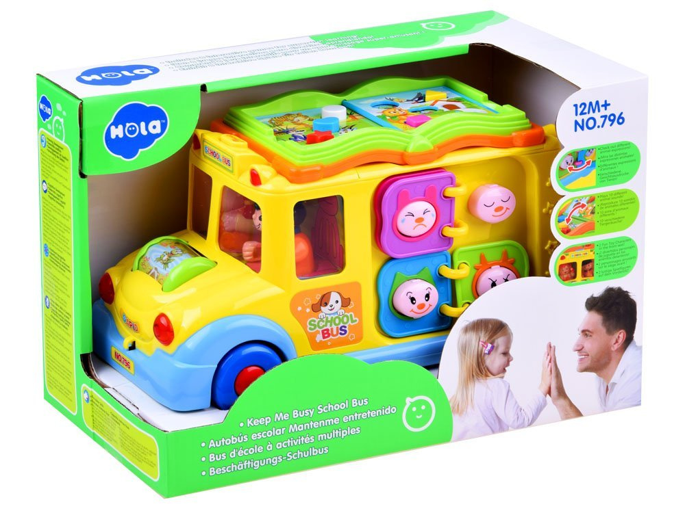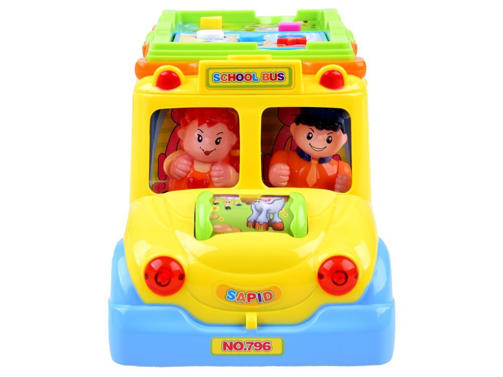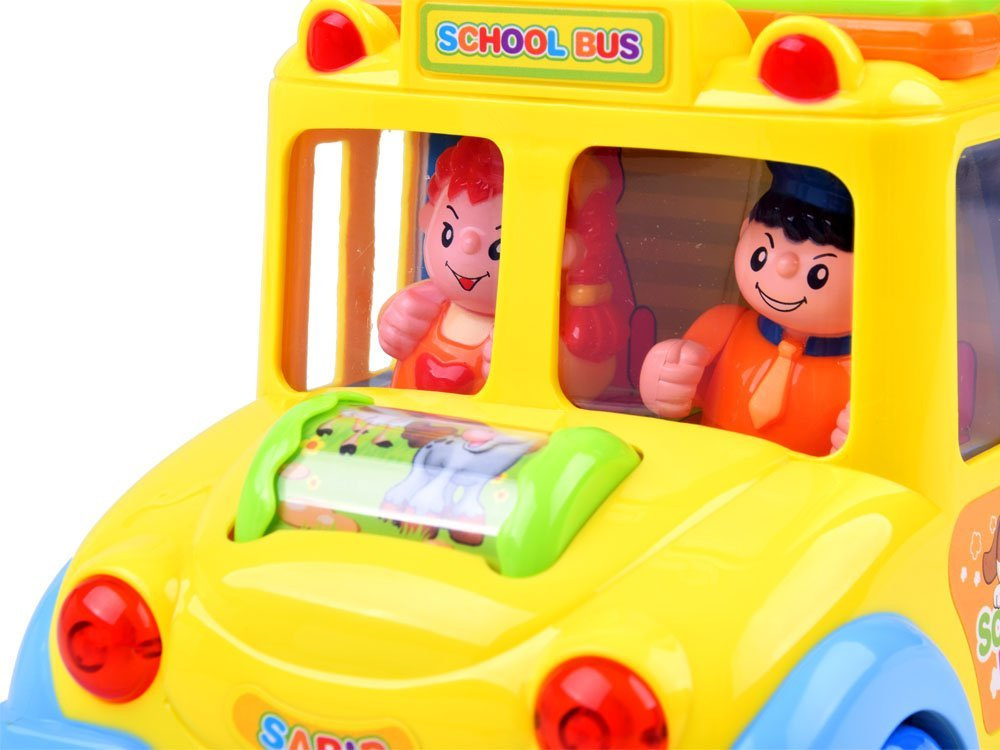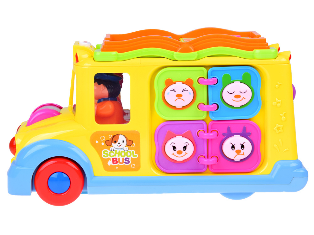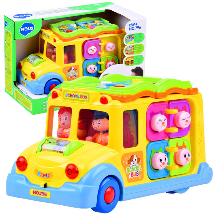 Igrača je nova, zelo natančno in estetsko izdelana, v živih privlačnih barvah.PREDNOSTI IGRAČEIgrača se lahko sama premika in spremeni smer vožnje vsakič, ko naleti na oviro, vendar jo lahko otrok tudi samostojno upravlja. Med vožnjo igra vesela glasba in utripajo sprednje luči. V sprednjem delu avtobusa je barvni vrtljivi valj z živalmi, ki ob vrtenju sproži zvoke smejočega se otroka in melodijo. Na strehi igrače je barvna brošura z gumbi različnih barv in oblik. S pritiskom na gumbe se sprožijo zvoki živali, ki so na sliki. Gumbi prav tako sprožijo zvoke hupa, zagona motorja in melodije. Na strani avtomobila so 4 smeškoti z različnimi izrazi od veselega do žalostnega. Smeškoti so obdani z barvnimi okvirji, ki so razporejeni kot strani knjige. Na drugi strani vozila so 4 zobniki z ročico, ki jo je mogoče vrteti. Na zadnji strani igrače so vrata z zvoncem, ki oddaja zvok. Za vrati so barvne slike, ki se spreminjajo, ko obrneš ključ.S to igračo bo vaš otrok lahko vadil:- ročne-motorične spretnosti- prepoznavanje oblik- barve- zvoke, hrupTa zelo impresiven in čaroben avtobus deluje na 3 baterije AA (navadne palčke) - niso priložene.Dimenzije igrače:- dolžina 25 cm- širina 12 cm- višina 14 cmVse je zapakirano v estetsko barvito škatlo, ki je idealna kot darilo.
