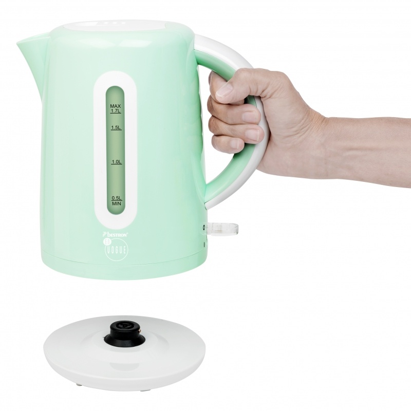 Hitro zavre vodo za čaj, juho itd. Prostornina 1,7 l Samodejna zaustavitev vrenja in zaščita pred vklopom "na suho". Integrirani grelni element, odporen proti nabiranju vodnega kamna. Kazalnik nivoja na obeh straneh. Vrtljiv pokrov z varnostno ključavnico. Praktičen navijalni kabel, stikalo s kontrolno lučko, nedrseče nogice.