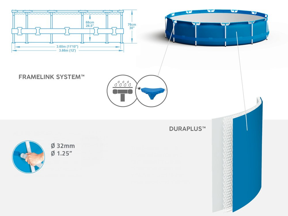 Stene tega bazena so izdelane iz materiala DuraPlus, ojačanega s poliestrsko mrežo in dvema plastema močnega PVC-ja, kar zagotavlja odlično trdnost in vzdržljivost.