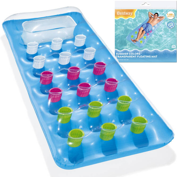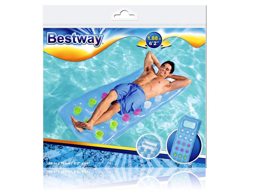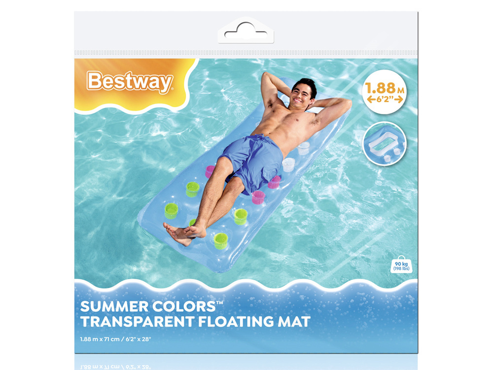 Senzacionalna napihljiva blazina Bestway je odlična za lenarjenje v vodi. Čudovita barvna vzmetnica s prozornim oknom vam bo zagotovila čist užitek sprostitve. Ta izdelek v svežih poletnih barvah bo zelo dobro izstopal na vsaki plaži. Vzmetnica je izdelana iz PVC plastike. Njegova največja obremenitev je 90 kilogramov. Na vzmetnico dimenzij 188 x 71 cm se brez težav prilega tudi odrasla oseba.V primeru poškodbe napihljive površine je priložen obliž za popravilo.Vzmetnica ima dve zračni komori, ki sta dodatno zaščiteni proti uhajanju zraka.