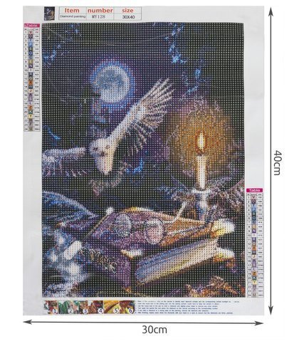 SPECIFIKACIJA – vzorec: sova; platno prekrito z lepilno plastjo: da; v kompletu: barvni diamanti, aplikator, suho lepilo, posodica; dimenzija: 30x40 cm; dimenzija slike: 25x35 cm; teža: 0,1 kg; teža v pakiranju: 0,103 kg