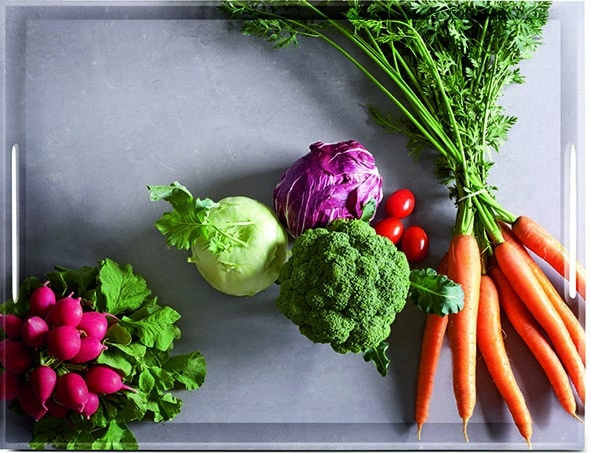 odličen pomočnik pri postrežbi doma in na vrtu izdelano iz visokokakovostne plastike MF lastnosti materiala: neprosojen, visok sijaj, odporen proti praskam in urezninam barvno obstojen, zložljiv dimenzije: 40 x 31 cm dekor: zelenjava