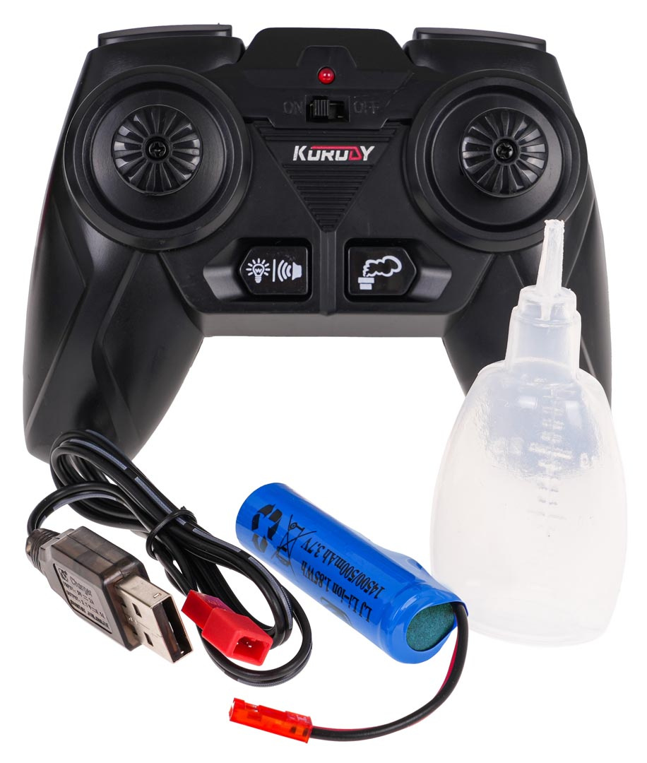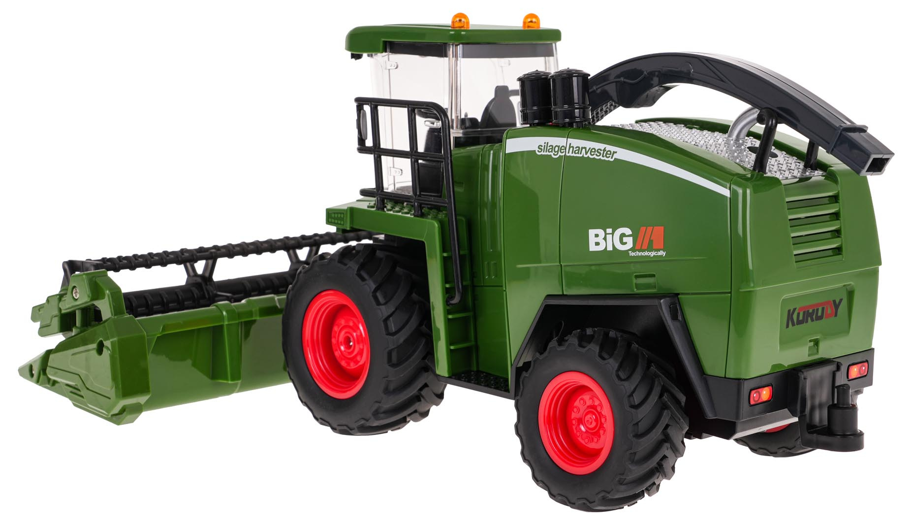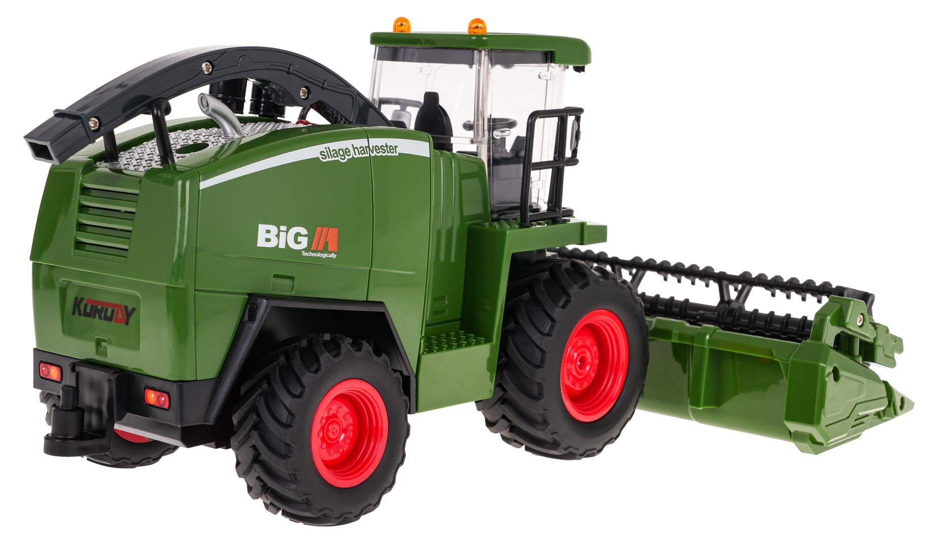 Daljinsko vodeni kombajn 2v1 z zvočnimi, svetlobnimi in dimnimi učinki za otroke od 3. leta dalje. Vozilo je izdelano iz najkakovostnejše plastike v živih barvah, zelo zvesto je izdelano po pravem stroju. Stroj oddaja zvoke in ima osvetlitev (sprednji del kabine in streha kabine). Polnilno cev lahko vrtimo, rezalni diski pa se med vožnjo vrtijo. V kompletu se nahaja žitna žaga in koruzna žaga, ki ju lahko uporabljamo izmenično. Kombajn ima gumijaste pnevmatike, ki mu zagotavljajo dober oprijem na površini. Igrača je napajana z akumulatorjem tipa 3,7 V 500 mAh (v paketu), upravljalnik z baterijami 2 x AAA 1,5 V (niso priložene).
