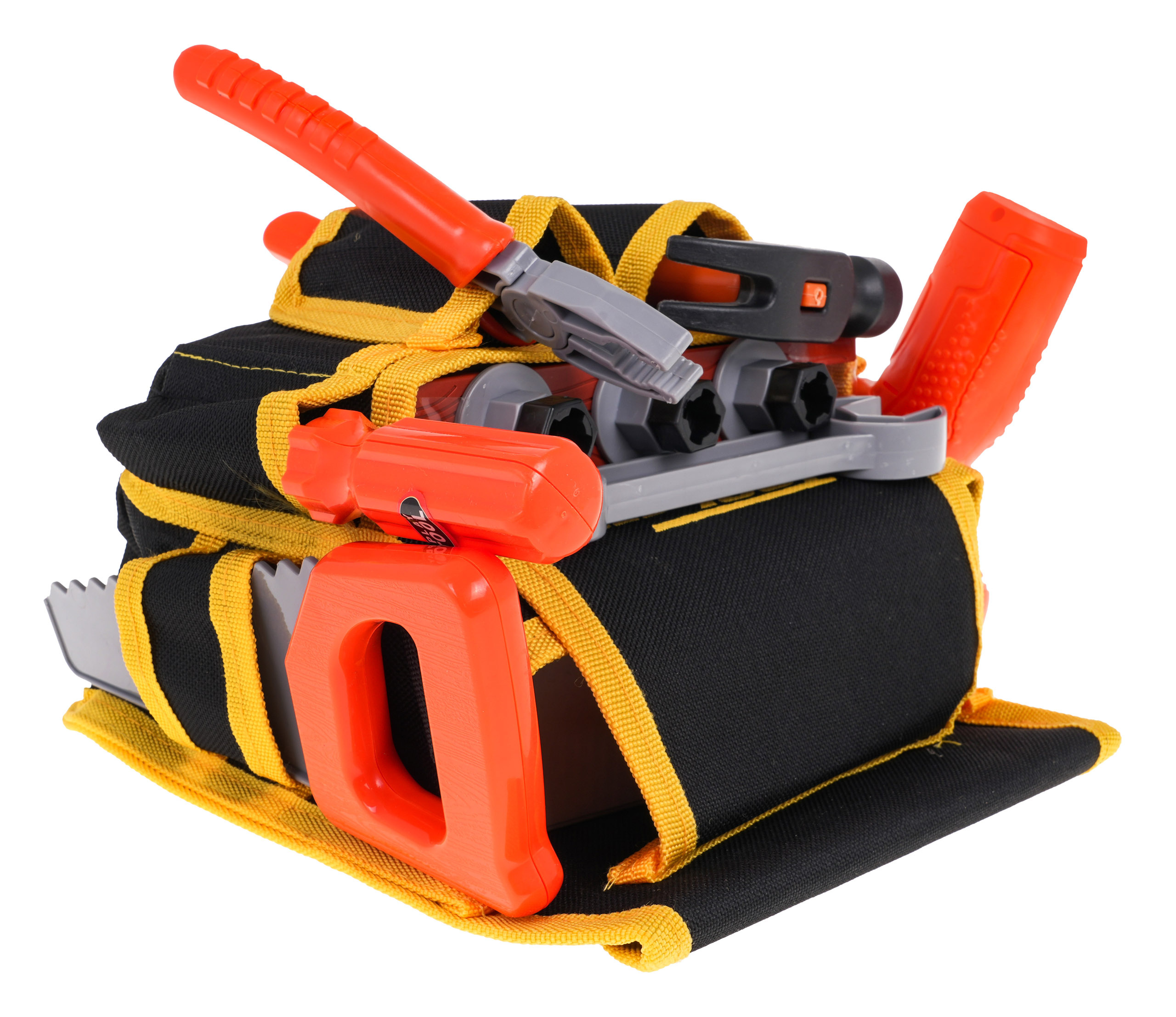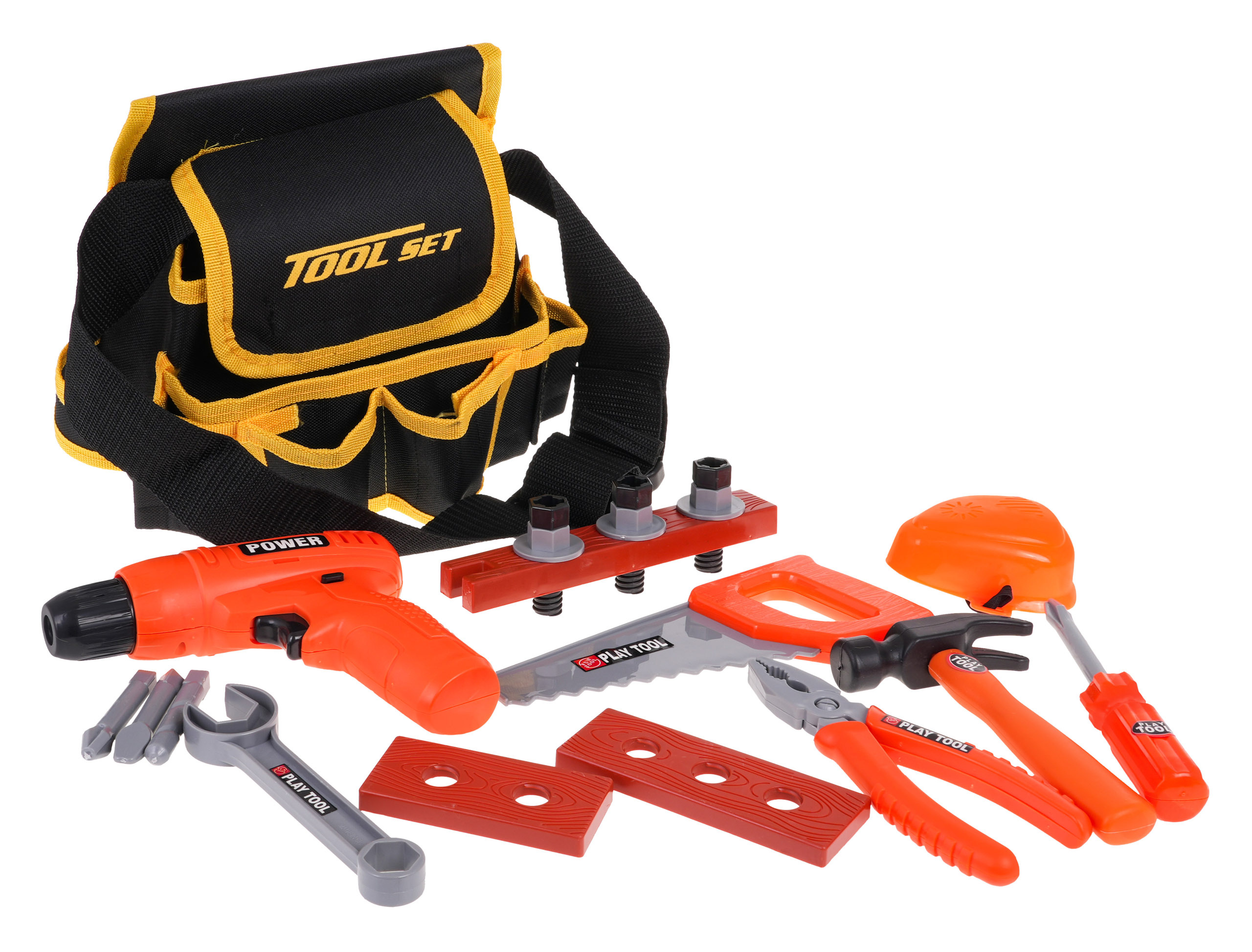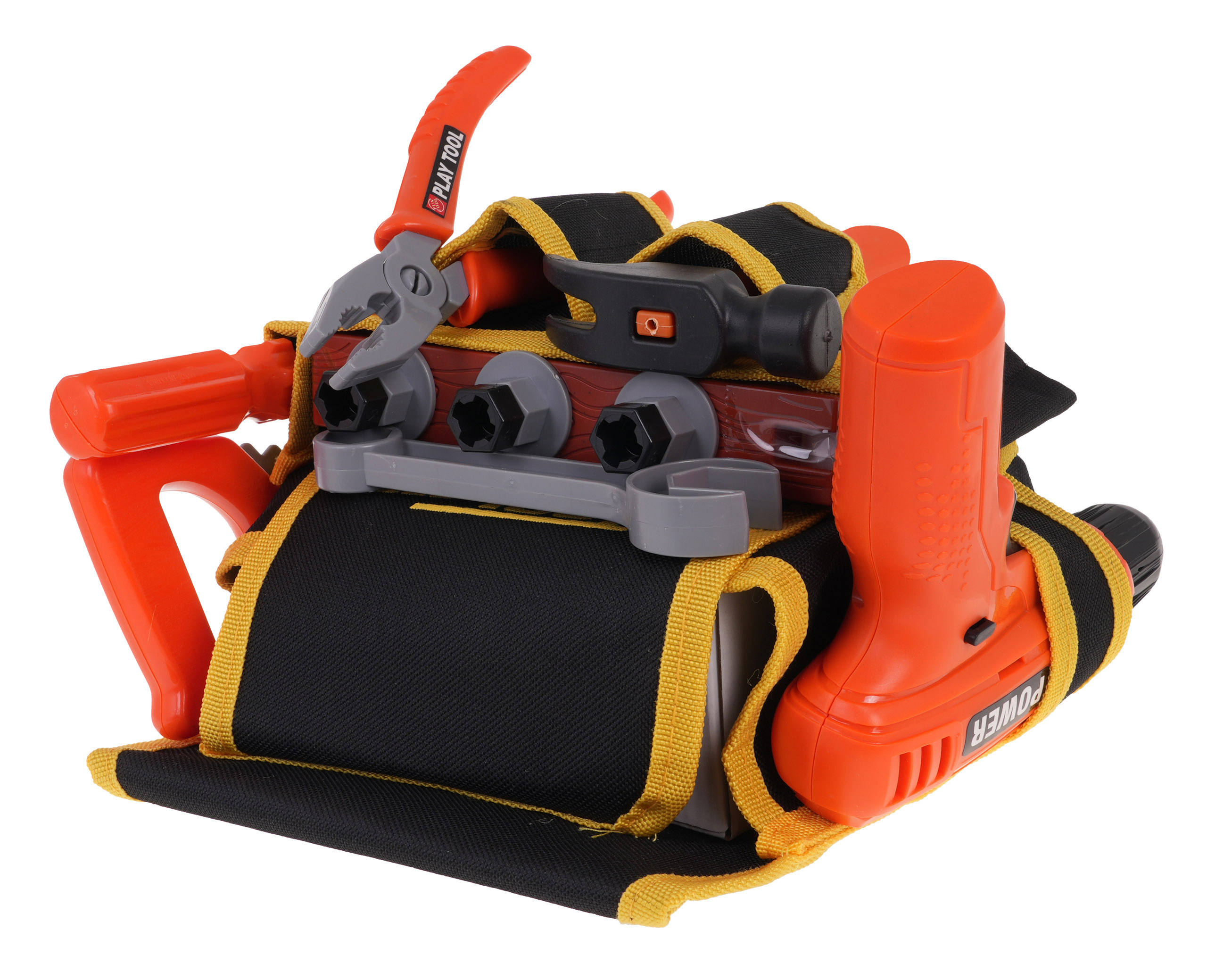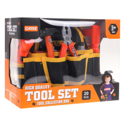 Odlično izdelan DIY trak z dodatki je primeren za otroke od 3 let. Pas - večnamenska torba, ki na videz zavajajoče spominja na pravi pas. Ima glavni predal na ježka in vrsto sprednjih in stranskih predalov. Torba je opremljena z udobnim nastavljivim trakom z zaponko, ki ga je mogoče obesiti čez boke. Set vsebuje orodje za domače mojstre, kot so vrtalnik/vijačnik, zaščitna maska, žaga, izvijač, kladivo, matice, izvijač, vrtalnik in plastični sveder z luknjami za vijake. Izvijač napajajo 2 bateriji AA 1,5 V, baterije niso priložene.