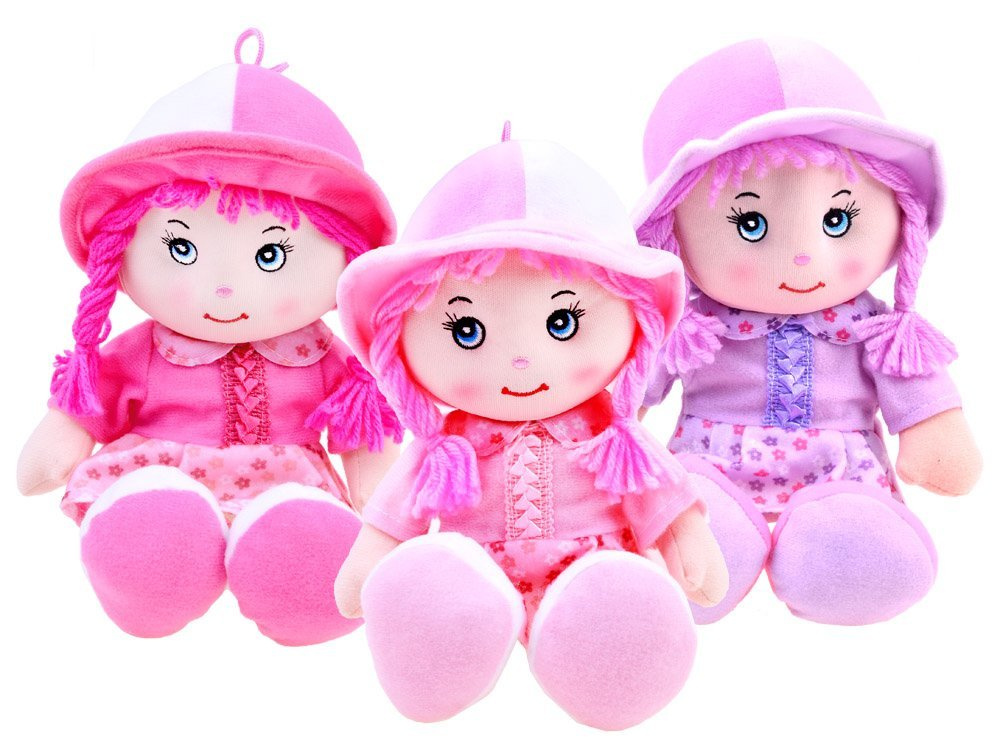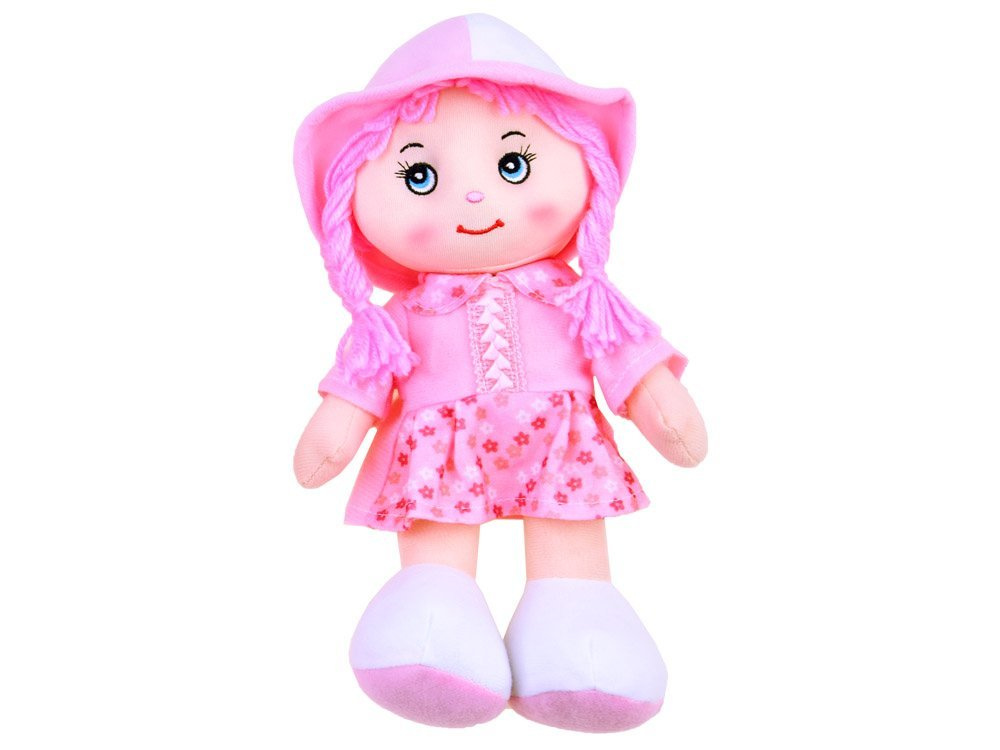 Punčka je mehka s kitkami, nosi ljubek klobuček in oblekico.