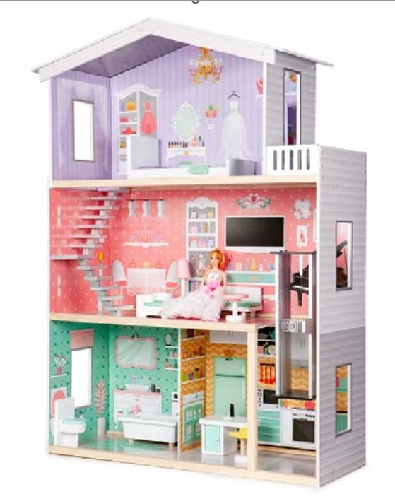 Hiša za punčke, pastelna lesena vila + 117 cm pohištva