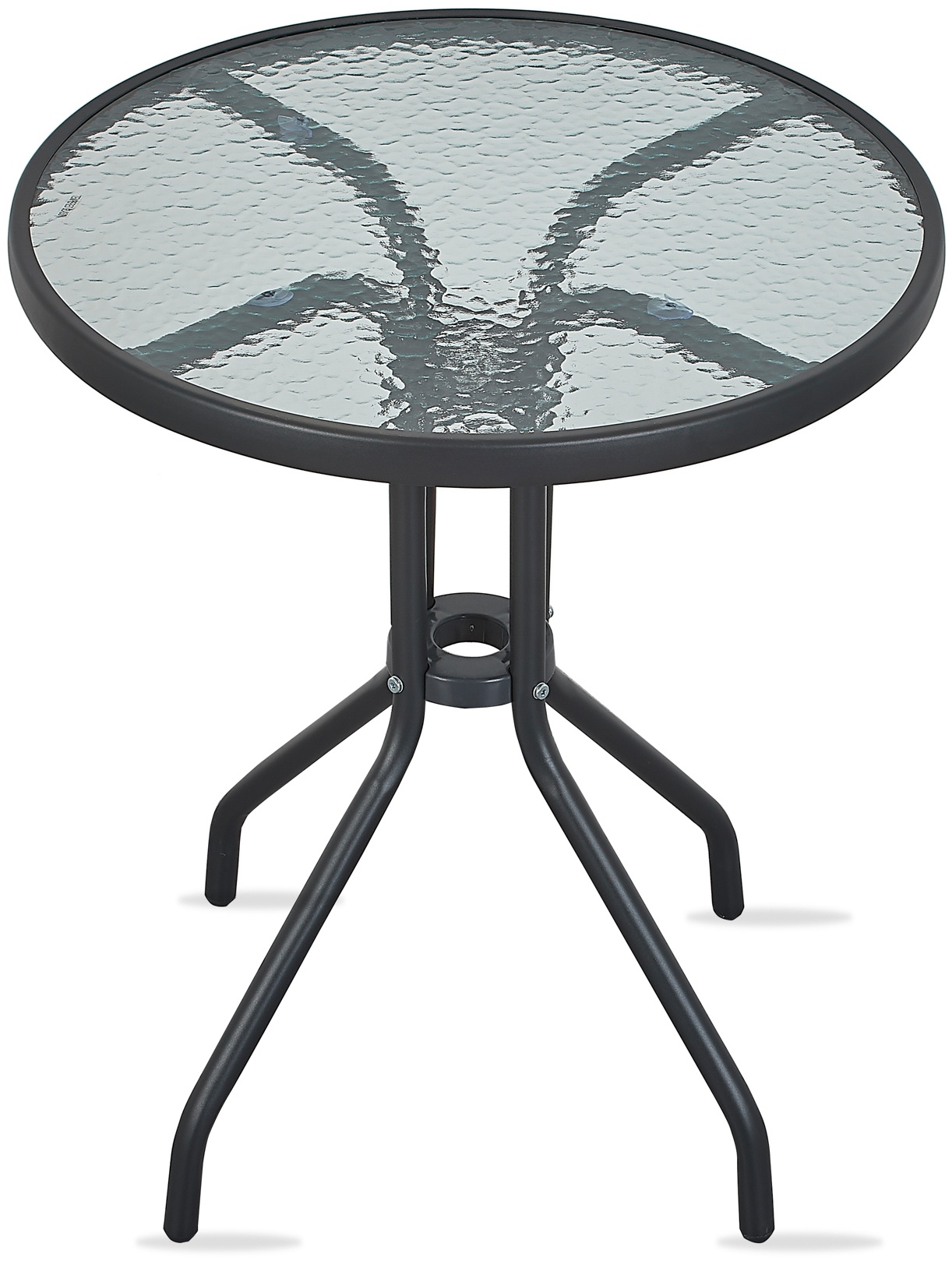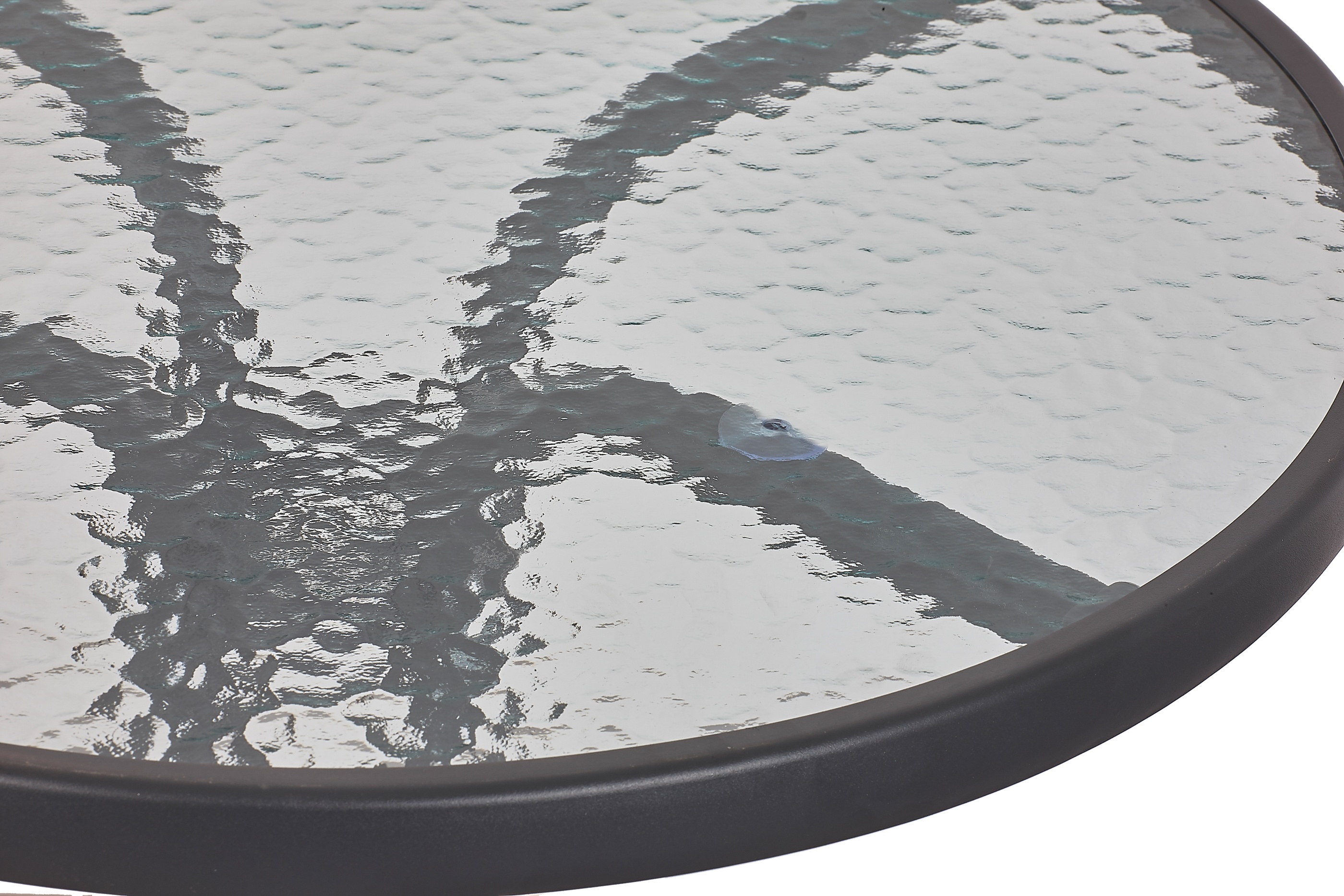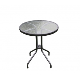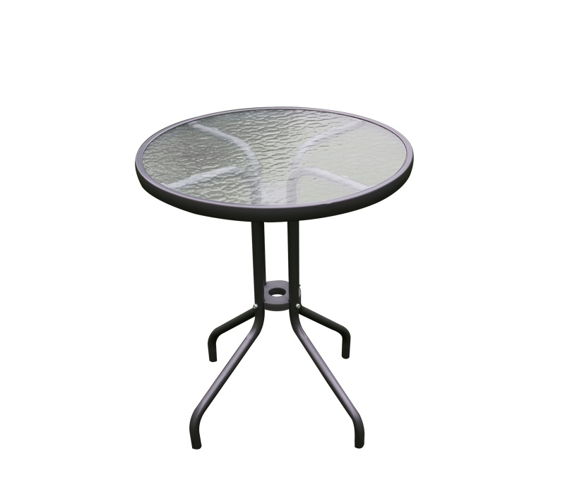 Vrtna miza s trdnim kovinskim okvirjem in rebrasto stekleno ploščo v sodobnem dizajnu, primerna za vrtove, terase, kavarne, paviljone, balkone ali plaže.