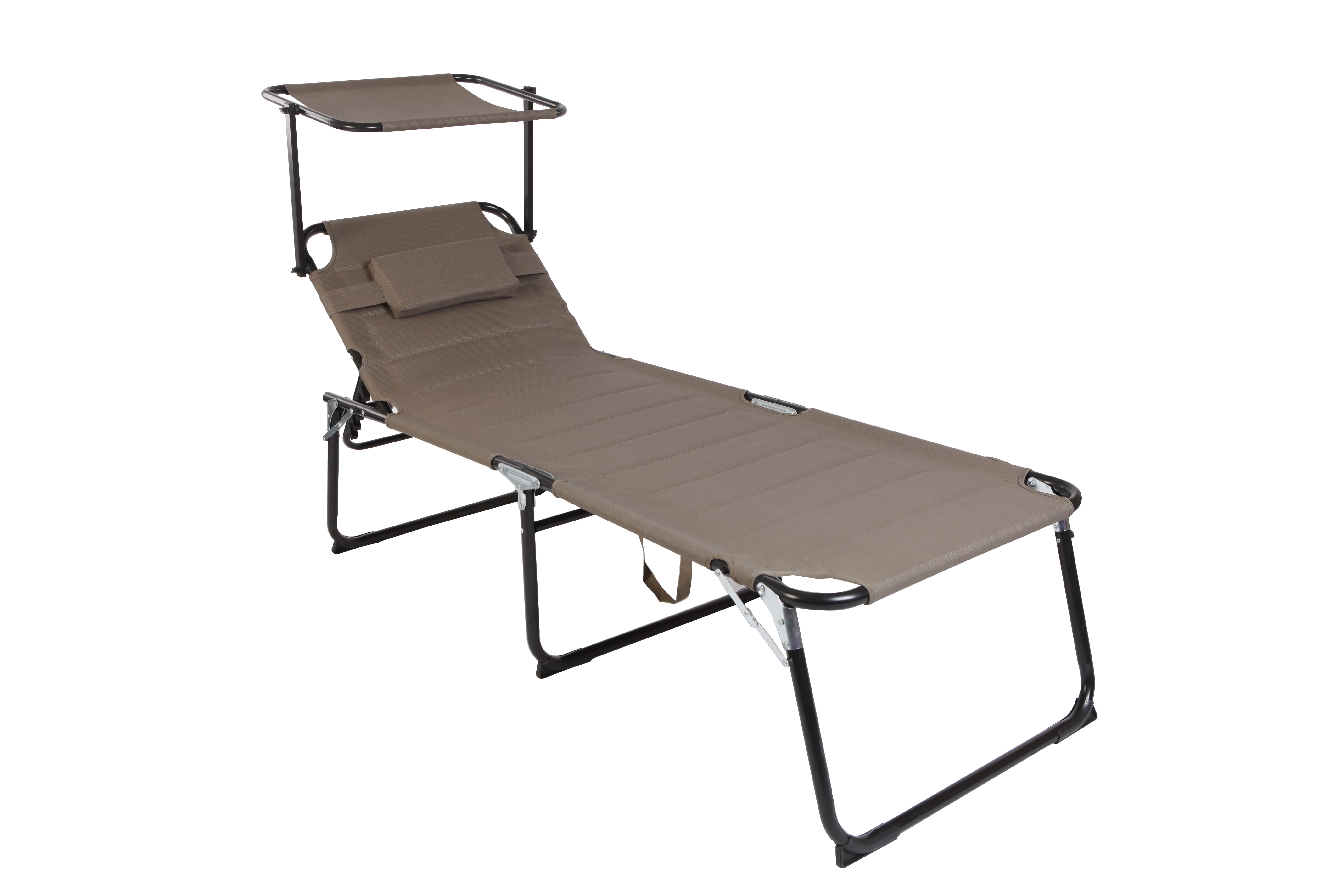Zložljiv vrtni ležalnik s streho in oblazinjenjem ter ojačano aluminijasto konstrukcijo, v modernem dizajnu, primeren za vrtove, kampiranje ali plaže.