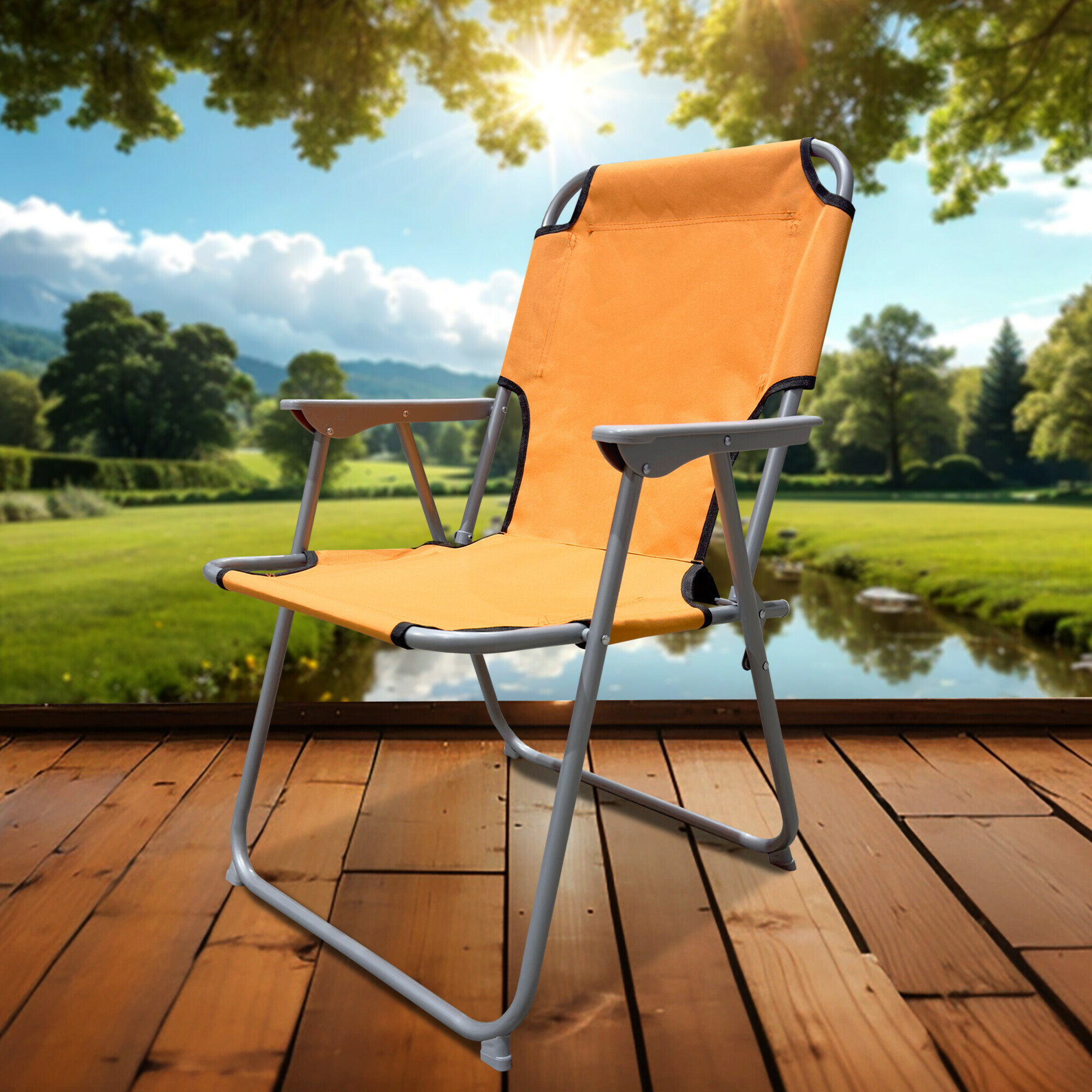 Zložljiv vrtni stol z udobnimi nasloni za roke, idealen za kampiranje, vendar bo zagotovo našel svojo uporabo tudi pri ribičih, modelarjih, vikendaših in lastnikih počitniških hiš.