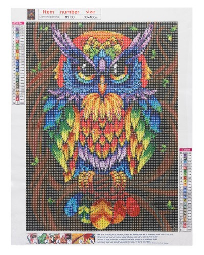 Priporočamo, da vedno odkrijete tisti kos platna, na katerem delate, da se ne izgubi viskoznost lepila. Kamenčki so razdeljeni v več vrečk in označeni s kodo. Platno vsebuje legendo, kjer po dodeljenih kodah prepoznate, kam lepiti kamenčke. vzorec: sova