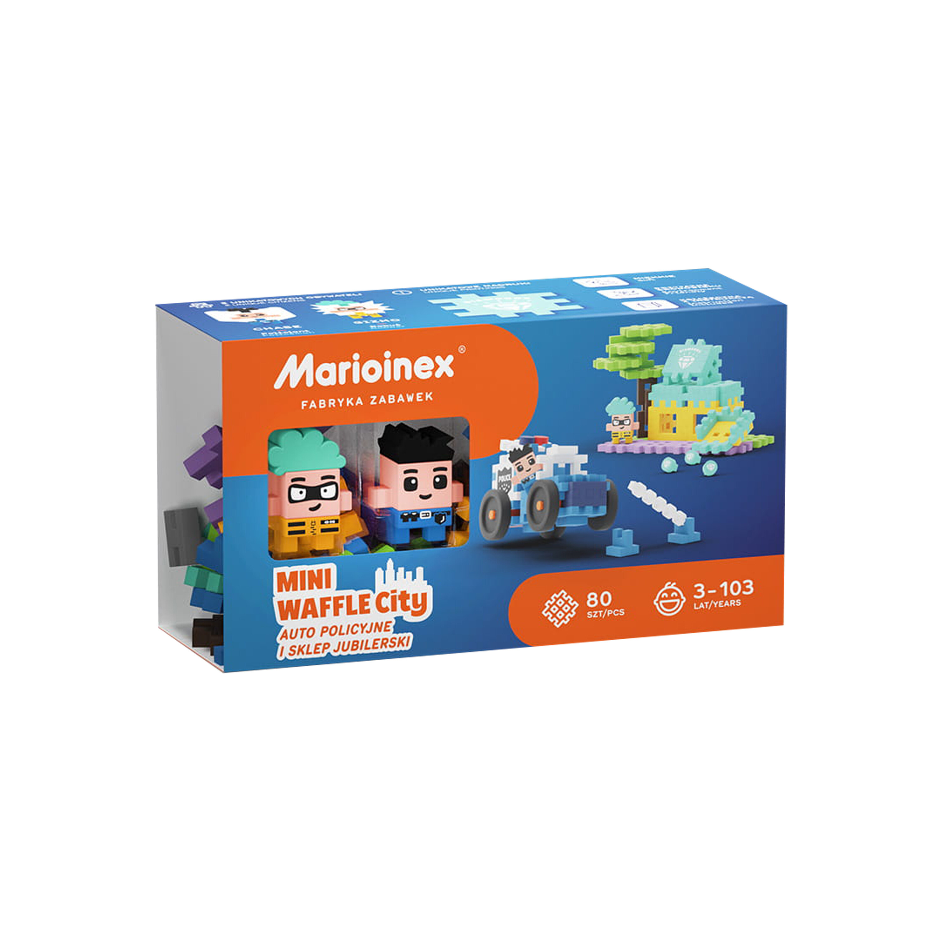 Vživite se v vlogo junaškega policista in ujemite brezobzirnega roparja, ali pa izberite stran Gizma in se poskusite izogniti divjemu pregonu.Kombiniraj komplet z drugimi iz serije Waffle City in razširi mesto z draguljarno in drugimi figuricami.