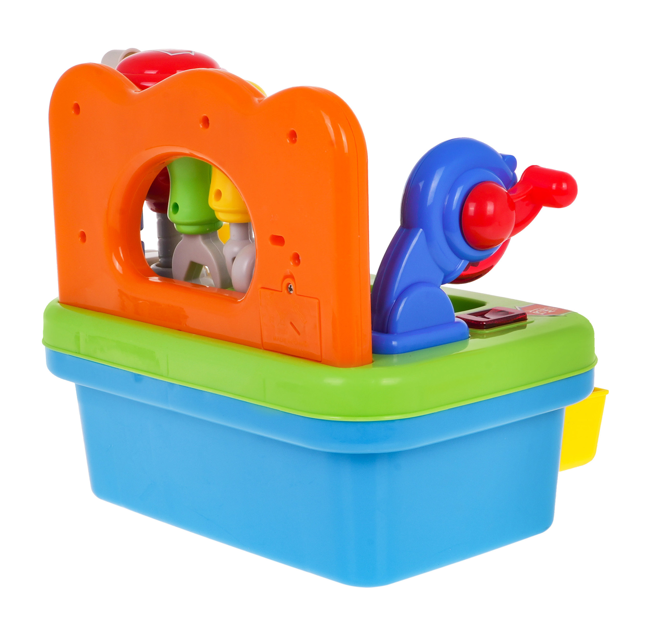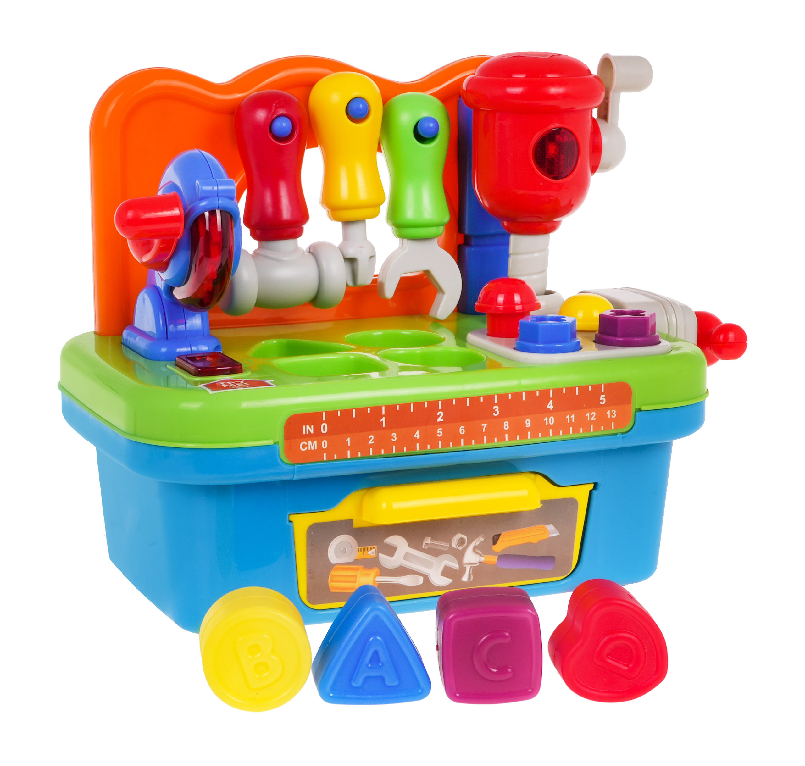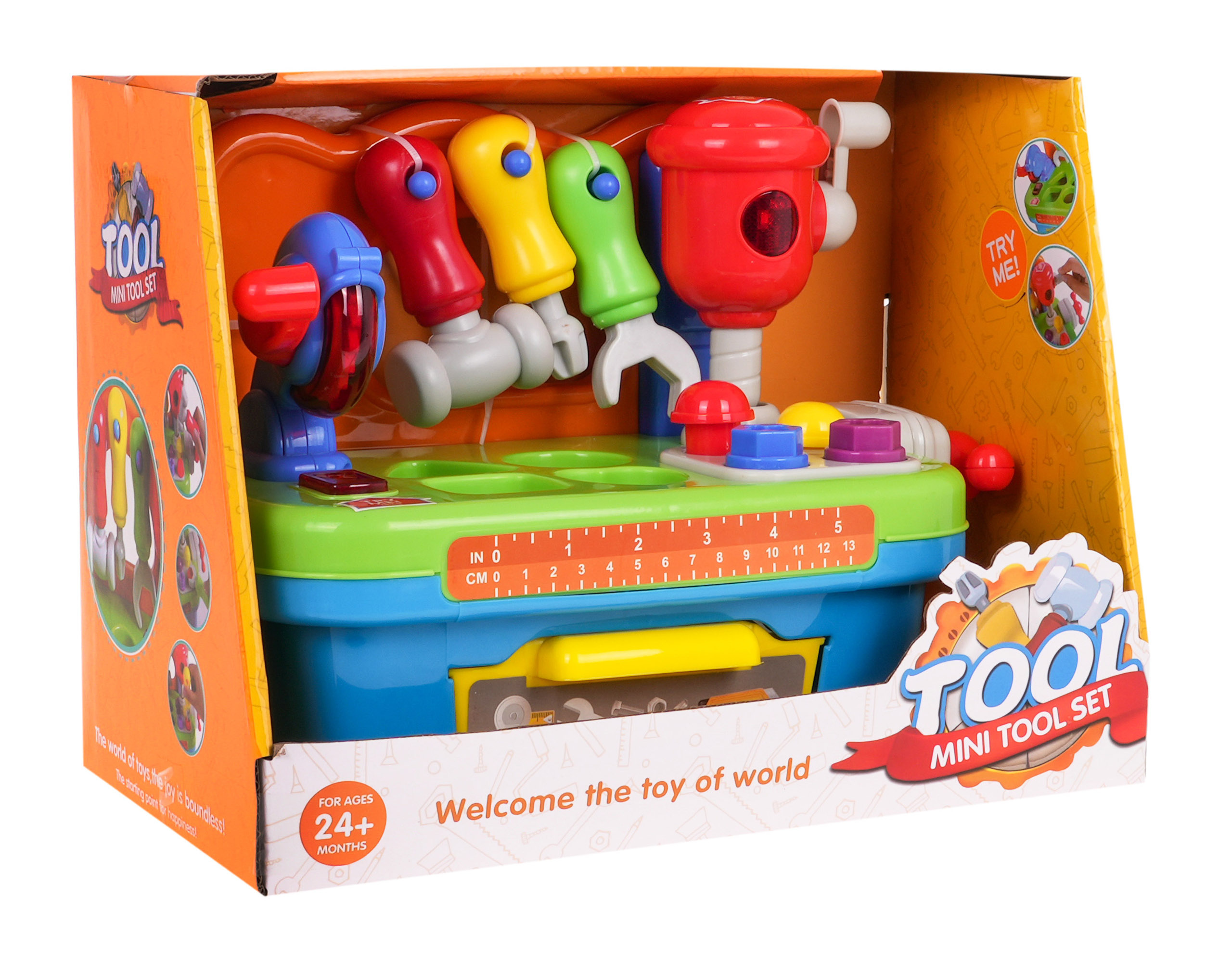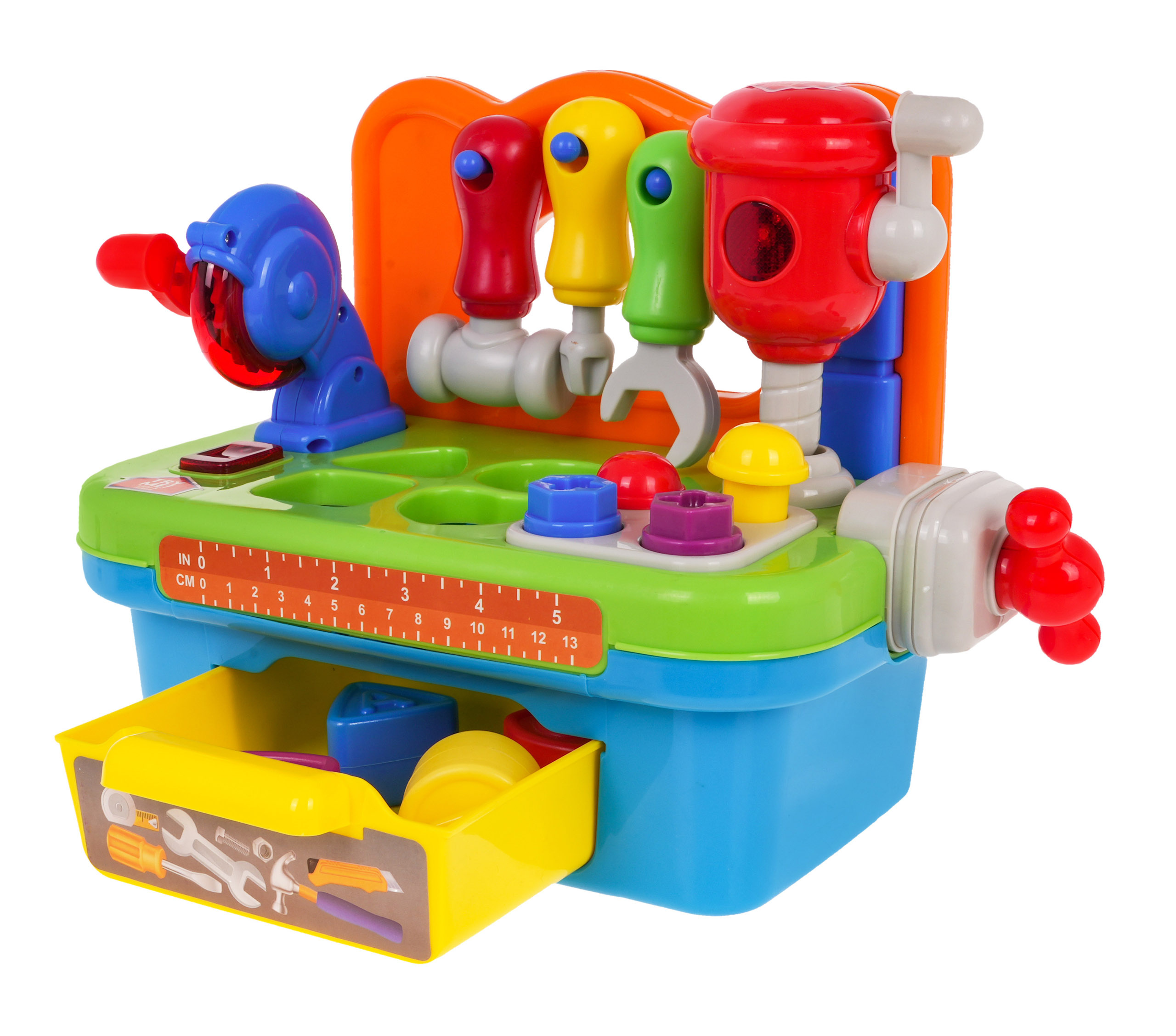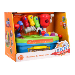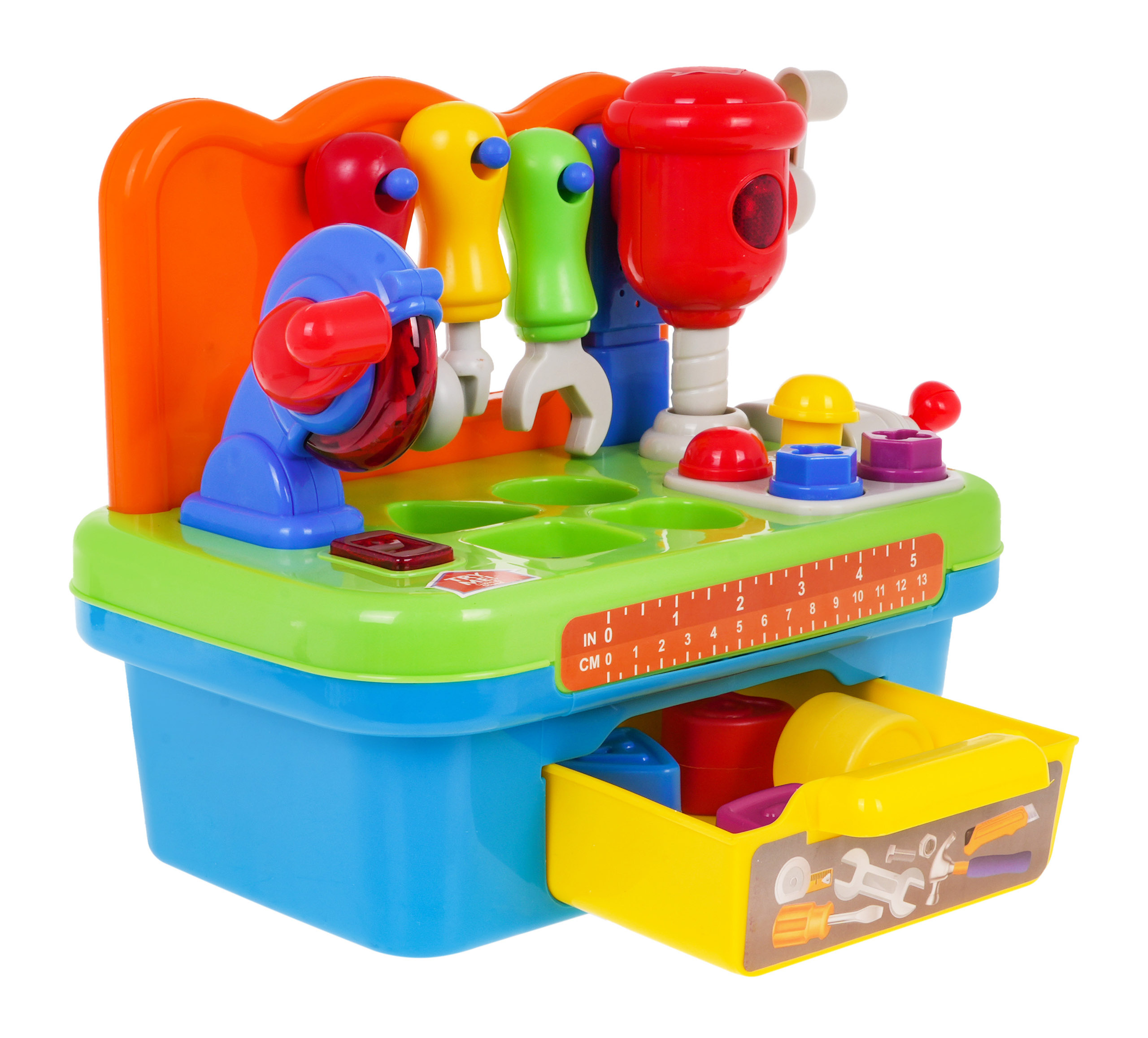 Večnamenska interaktivna igrača z zvočno in svetlobno funkcijo je primerna za otroke od 24 mesecev dalje. Delavnica za mojstre je opremljena s številnimi funkcijami. Na voljo je rotacijska krožna žaga in udarno kladivo. Vsako orodje je opremljeno s praktičnim ročajem, s katerim se zažene. Na delovni mizi je pritrjen primež, ki našemu malemu otroku omogoča, da se nauči refleksov pri privijanju in odvijanju, ob spremljavi ropotajočih zvokov. Delavnica bo vključevala žeblje za zabijanje in vijake za privijanje. K dodatni opremi spadajo orodja: izvijač, ključ in kladivo, vse v velikostih, ki popolnoma ustrezajo majhnim otroškim rokam. Delavnica je tudi odličen kraj za vadbo prepoznavanja oblik in ujemanja. Delovna plošča mize je opremljena s sortirnikom, ki je odličen za razvoj otrokovih spretnosti. Vse dele, ki se prilegajo ustreznim odprtinam, najdete v priročnem predalu na spodnjem delu igrače. Delavnica je napajana s 3 baterijami AG13, ki so priložene.