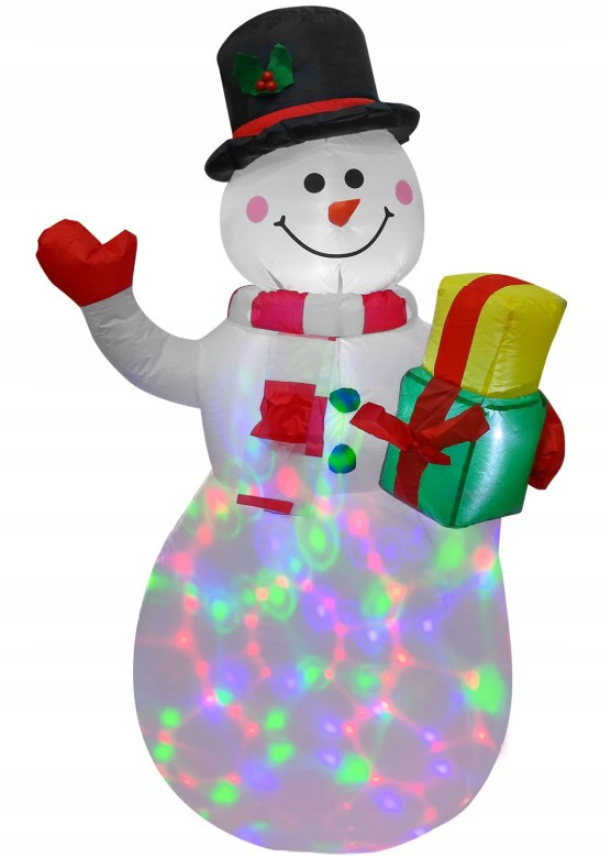 BALWAN z darilom - VELIK 150 cm z LED osvetlitvijo E-943599 Dekorativni snežak z LED osvetlitvijo, ki bo videti čudovito na vsakem vrtu. Poudari praznično vzdušje in pritegne pozornost. Višina: 150 cm Širina: 80 cm (na najširšem mestu) ČUDOVITA DEKORACIJA - POPOLNO DARILO IDEAL Samonapihljiva božična dekoracija (vgrajena črpalka) LED diode za osvetlitev dekoracije - vgrajene znotraj Material odporen na vremenske vplive Stopnja vodoodpornosti - IP44 Dolžina napajalnega kabla: 2 m Napetost: 230V / 50Hz Vgrajen kompresor in rotirajoči LED projektor Snežak ima vgrajen kompresor, ki ga napolni z zrakom. Poleg tega ima dekoracija vgrajen vrtljiv LED projektor, ki jo osvetljuje od znotraj. Po sončnem zahodu snežak sveti v mnogih barvah. VSEBINA KOMPLETA 4 klini 2 vrvi 2 obtežilne vreče Snežak je opremljen z dvema zankama iz trakov na višini pasu, ki služita za stabilizacijo figure s pomočjo 4 klinov, napetih na 2 vrveh. Svetlečemu snežaku dodatno težo dodata 2 vrečki, ki ju je mogoče napolniti z utežmi in postaviti v notranjost figure. ATMOSFERI ODPORNA Dekoracija je opremljena z napajalnikom z zaščito IP44.
