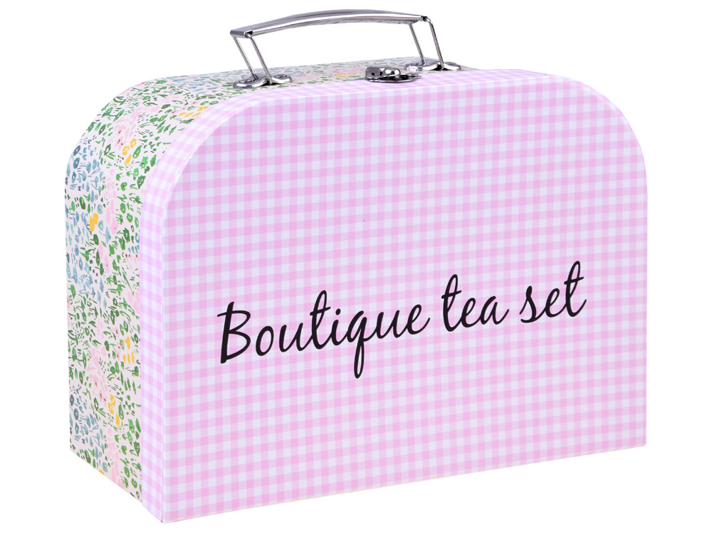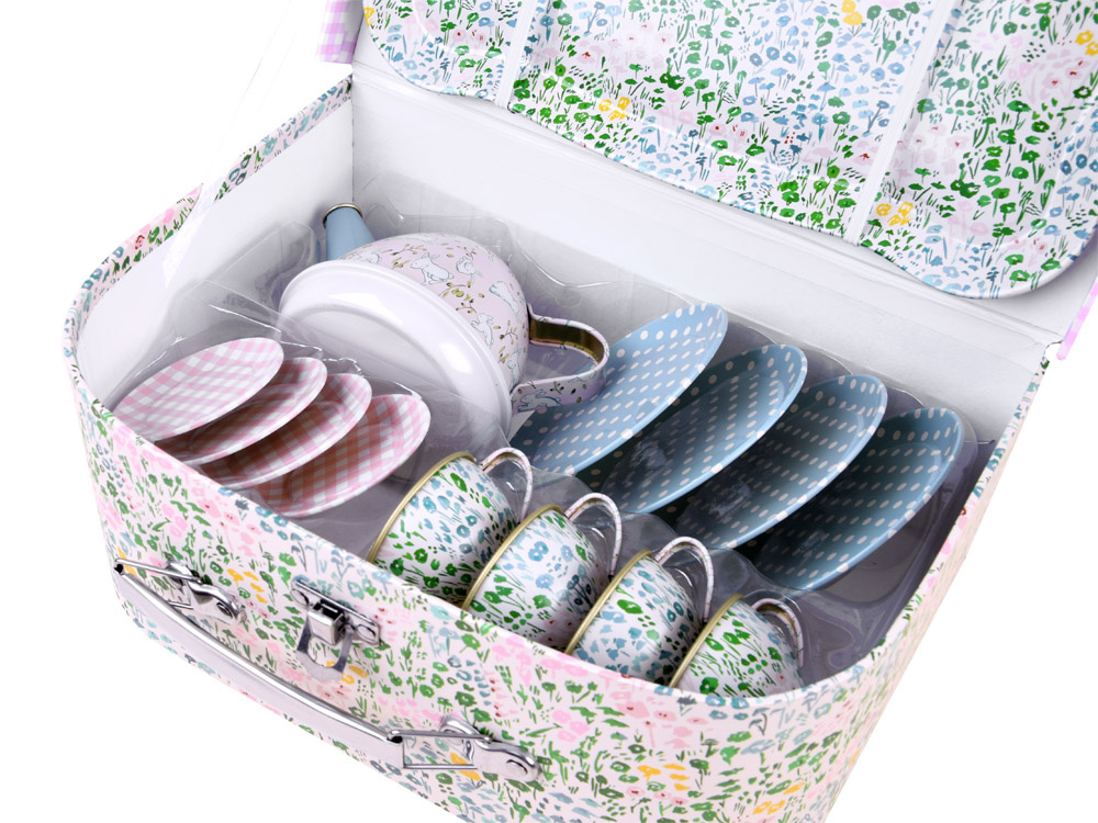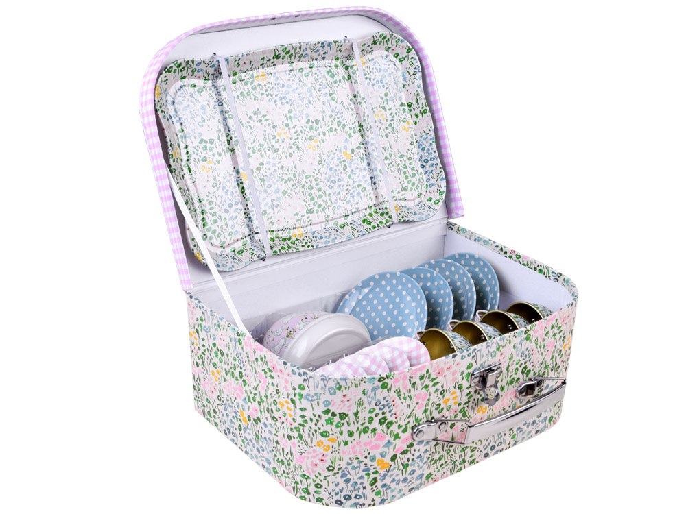 Kovček je izdelan iz trdega kartona v očarljivi travniški in karirasti izvedbi z dodatnimi kovinskimi elementi in bo primeren tudi za piknik, na igrišče ali v park.