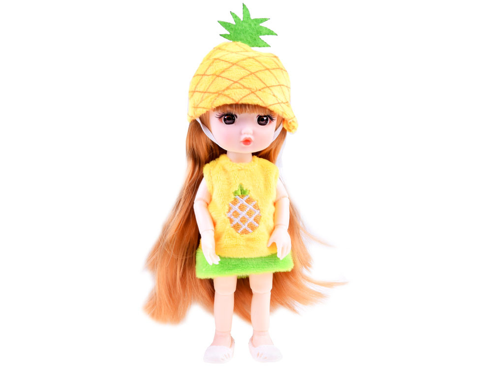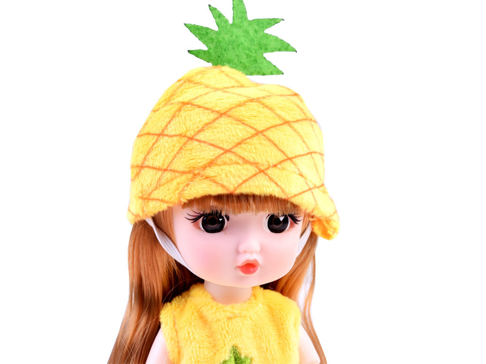 Igrača v sočno rumeni barvi ima dolge, sijoče blond lase, gibljive okončine, velike rjave oči in ljubek obraz. Punčka ananas oblečena v plišasto, mehko kapico in obleko z vezenim sadjem na izrezu. Ananasova punčka na nogah nosi razigrane, preluknjane čevlje. Dodatni bonus lutke je možnost obeska za ključe. Zahvaljujoč zlati sponki lahko punčka vedno potuje s svojim lastnikom. Preprosto jo pripnete na nahrbtnik, s katerim deklica hodi v vrtec, na peresnico, kozmetično torbico ali kamorkoli se odloči.Višina punčke je približno. 19 cm