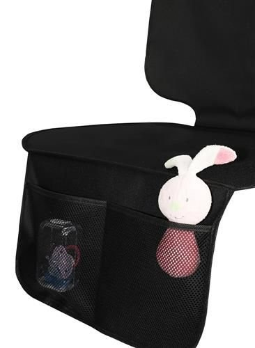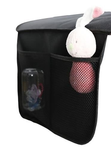 Zaščitna podloga je tam enostavna za sestavljanje - preprosto jo razgrnete na sedež in pritrdite na vzglavnik z elastičnim trakom, všitim v zgornji del naslonjala.Dva žepa na spodnjem delu blazine vam omogočata shranjevanje potrebnih stvari.Z zunanje strani so izdelani iz perforiranega materiala, kar omogoča hitro videti, kaj je notri.