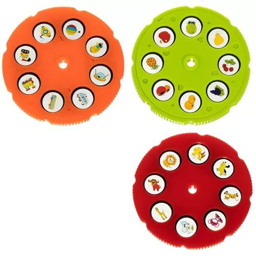3 DIAPOZITIVI S SLIKAMI - so bili del kompleta 3 diski s 24 slikami na različne teme: orodja, vozila, živali in sadje. Zahvaljujoč njim se bo malček začel učiti risati z risanjem črt vzdolž določenega vzorca.
