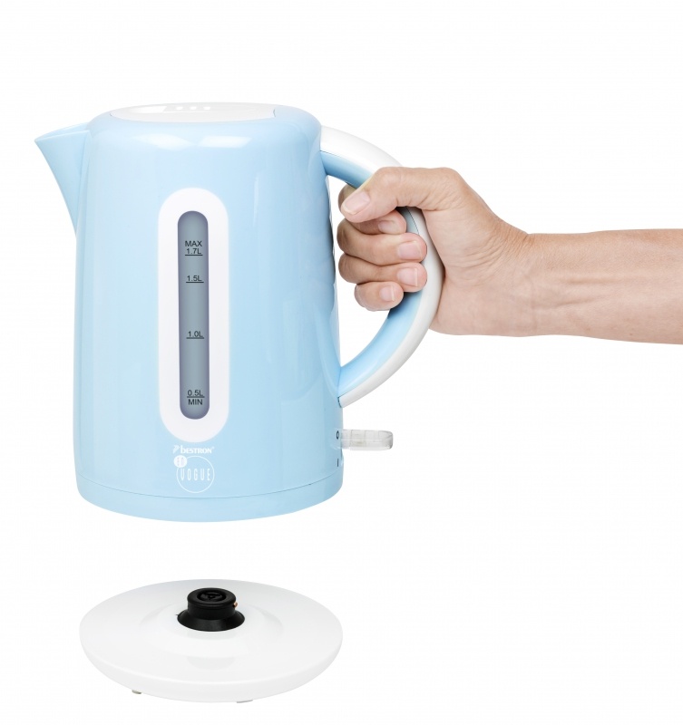 Prostornina 1,7 l Samodejni izklop pri vrenju in zaščita pred delovanjem "na suho" Vgrajen grelni element, odporen proti nabiranju vodnega kamna Kazalnik nivoja na obeh straneh Vrtljiv pokrov z varnostno ključavnico Praktično navijanje kabla Stikalo za vklop/izklop s kontrolno lučko Nedrseče nogice