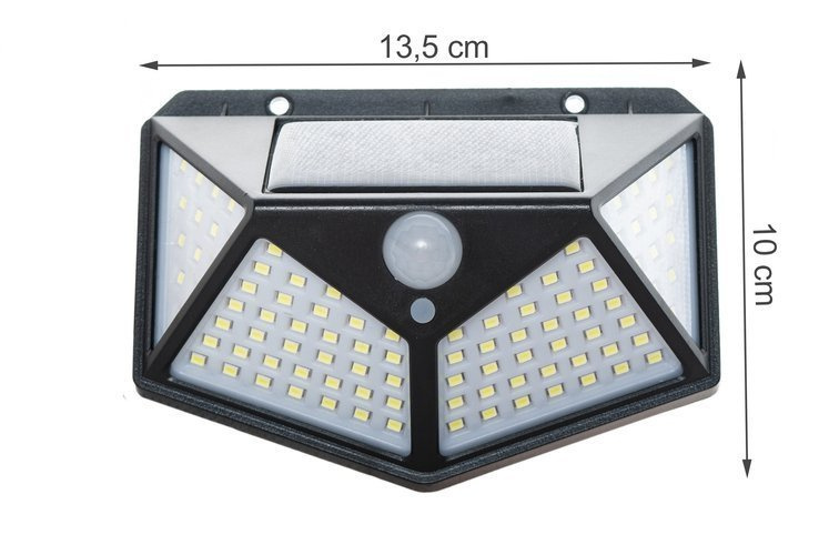 SPECIFIKACIJE - Črna barva; material: ABS + PC; število LED: 100; sončna plošča: monokristalna; baterija: litijeva 3,7V; izhodna moč: 7W; čas polnjenja: 6 ur na soncu; PIR kot zaznavanja: 120 stopinj; kot svetlobe: 270 stopinj; zaznavna razdalja: 8-10m; vodoodporno: IP65; dimenzije (širina / višina): 13,5 / 10 cm, teža: 0,15 kg; teža v paketu: 0,20 kg.