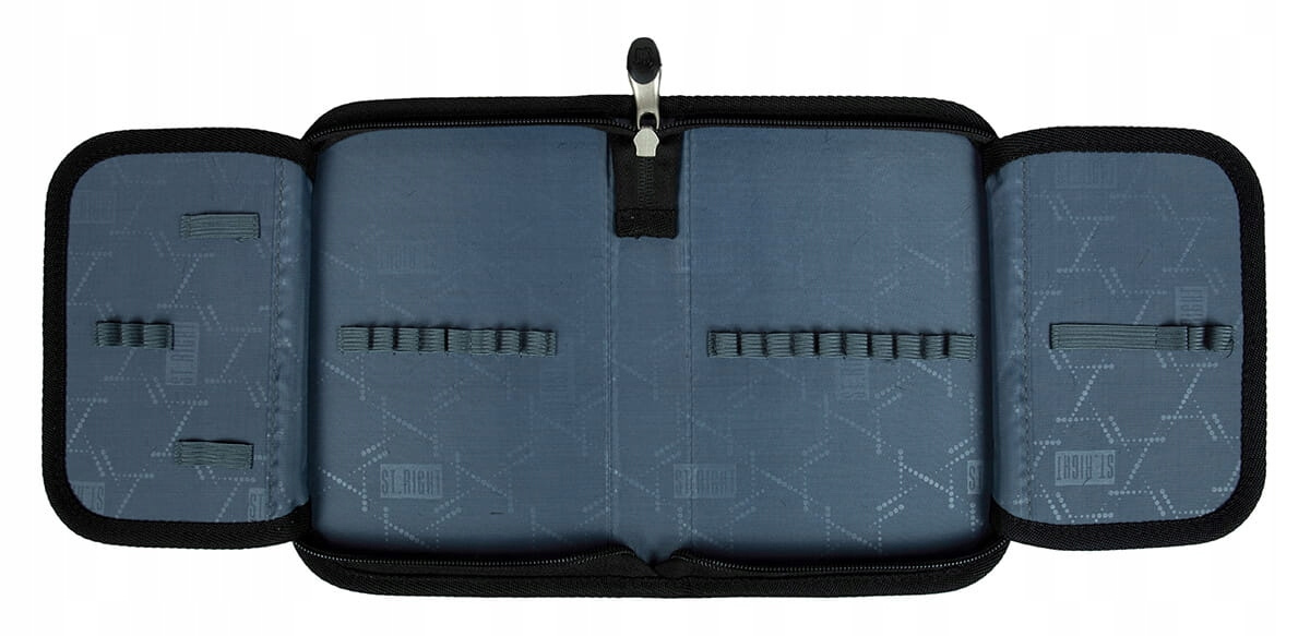 Ima veliko elastičnih gumijastih zank za shranjevanje šolskih potrebščin.