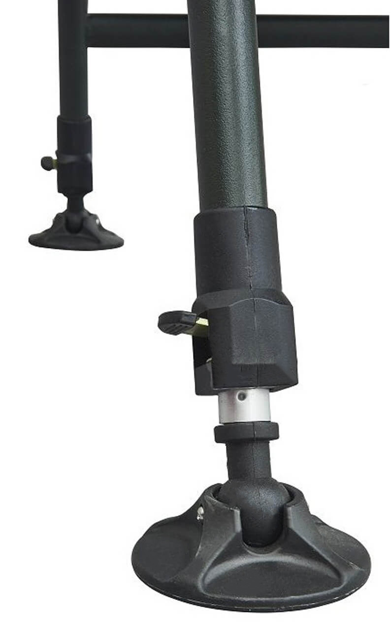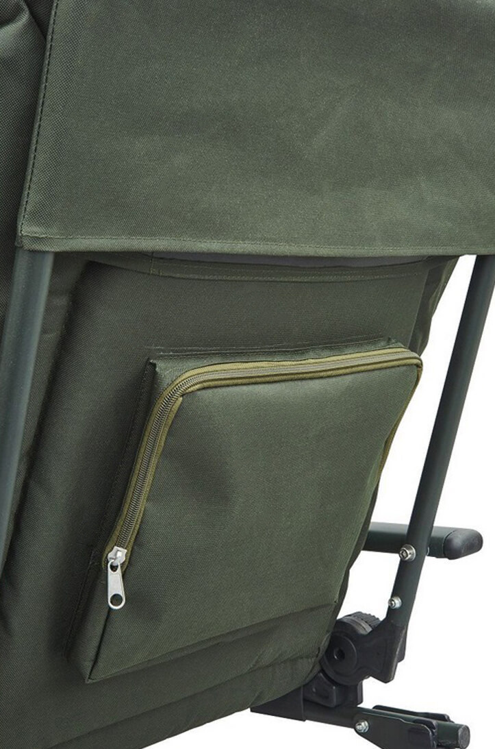 Na zadnji strani naslonjala je žep na zadrgo za shranjevanje drobnarij (29x26x3 cm). Na zgornji strani naslonjala je integrirano ojačano oblazinjenje kot naslon za glavo. Položaj naslonjala je mogoče nastaviti zahvaljujoč trdnemu sklepu.Nastavljive noge s širokimi podstavki proti pogrezanju zagotavljajo udobno možnost postavitve na neravnem terenu.