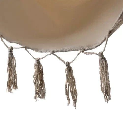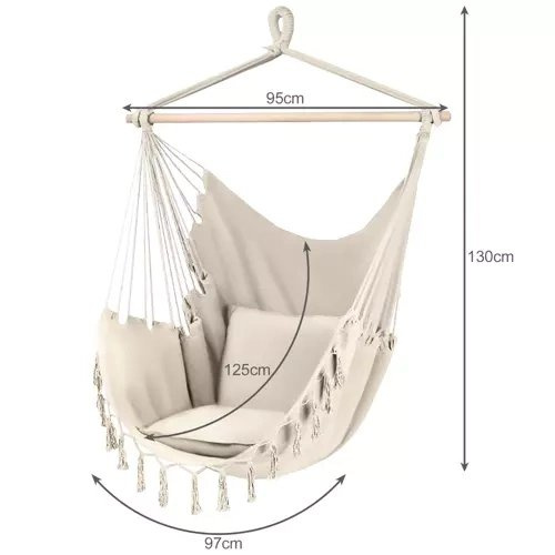 ODPORNI MATERIAL - 65% bombaž zagotavlja pravilno prezračevanje, kar vpliva na udobje uporabe visečega stola tudi v vročih dneh. Za trdnost sedeža je odgovorna 35% primes poliestra. Trdno montažno kolo je pritrjeno na vzdržljive vrvi, enakomerno razporejene po straneh viseče mreže preko lesene prečke. Ta konstrukcija tvori celoto enostavno se obesi in viseča mreža je dobro uravnotežena in stabilna.