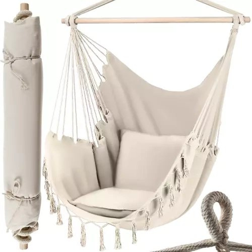 UDOBNO – ta izjemno udobna in funkcionalna viseča mreža – brazilski stol, vam omogoča sprostitev v ugodnih pogojih.Odlično se bo prilegala na vrtu, terasi, balkonu in celo v sobi! Uporabili jo boste med popoldanskim počitkom, kratkim spanjem ali sproščanjem s knjigo ali revijo.