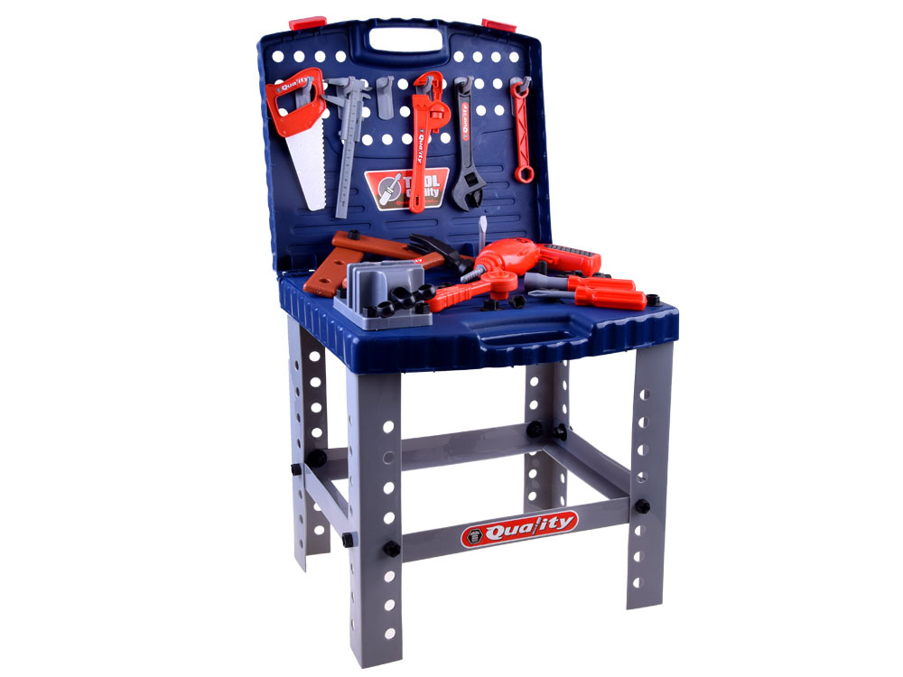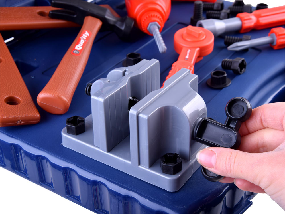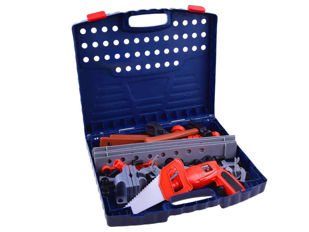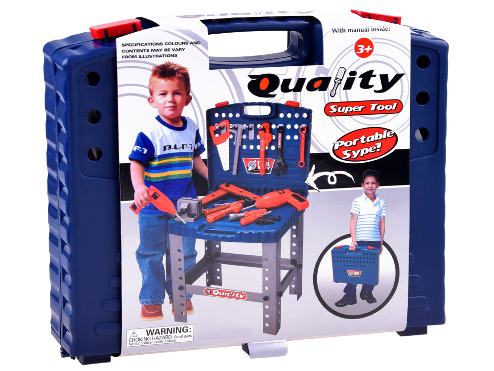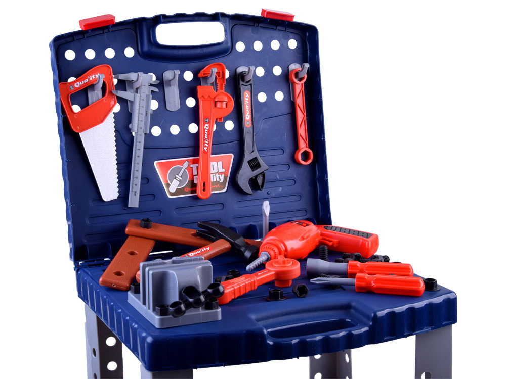 Bogat komplet za male mojstre, ki je shranjen v praktičnem kovčku, ki se zlahka spremeni v delavnico.
